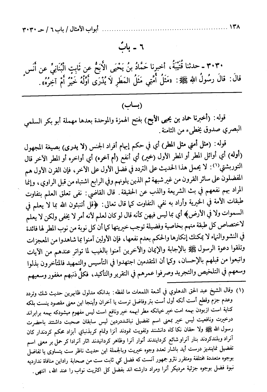قَوْلُهُ (مَثَلُ أُمَّتِي مَثَلُ الْمَطَرِ) أَيْ فِي حُكْمِ إِبْهَامِ أَفْرَادِ الْجِنْسِ (لَا يُدْرَى) بِصِيغَةِ الْمَجْهُولِ (أَوَّلُهُ) أَيْ أَوَائِلُ الْمَطَرِ أَوِ الْمَطَرُ الْأَوَّلُ (خَيْرٌ) أَيْ أَنْفَعُ (أَمْ آخِرُهُ) أَيْ أَوَاخِرُهُ أَوِ الْمَطَرُ الْآخِرُ قَالَ التوربشتي لَا يُحْمَلُ هَذَا الْحَدِيثُ عَلَى التَّرَدُّدِ فِي فَضْلِ الْأَوَّلِ عَلَى الْآخِرِ فَإِنَّ الْقَرْنَ الْأَوَّلَ هُمِ الْمُفَضَّلُونَ عَلَى سَائِرِ الْقُرُونِ مِنْ غَيْرِ شُبْهَةٍ ثُمَّ الَّذِينَ يَلُونَهُمْ وَفِي الرَّابِعِ اشْتِبَاهٌ مِنْ قِبَلِ الرَّاوِي وَإِنَّمَا الْمُرَادُ بِهِمْ نَفْعُهُمْ فِي بَثِّ الشَّرِيعَةِ وَالذَّبِّ عَنِ الْحَقِيقَةِ