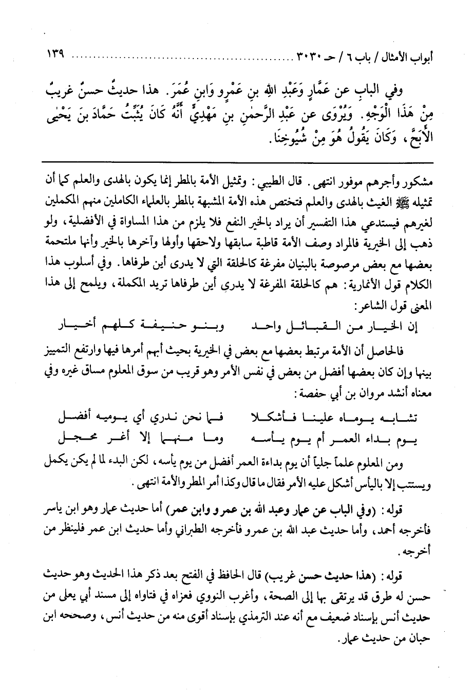 قَوْلُهُ (هَذَا حَدِيثٌ حَسَنٌ غَرِيبٌ) قَالَ الْحَافِظُ فِي الْفَتْحِ بَعْدَ ذِكْرِ هَذَا الْحَدِيثِ وَهُوَ حَدِيثٌ حَسَنٌ لَهُ طُرُقٌ قَدْ يَرْتَقِي بِهَا إِلَى الصِّحَّةِ وَأَغْرَبَ النَّوَوِيُّ فَعَزَاهُ فِي فَتَاوَاهُ إِلَى مُسْنَدِ أَبِي يَعْلَى مِنْ حَدِيثِ أَنَسٍ بِإِسْنَادٍ ضَعِيفٍ مَعَ أَنَّهُ عِنْدَ التِّرْمِذِيِّ بِإِسْنَادٍ أَقْوَى مِنْهُ مِنْ حديث أنس وصححه بن حِبَّانَ مِنْ حَدِيثِ عَمَّارٍ