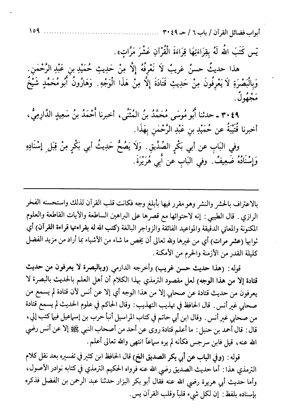قَوْلُهُ (هَذَا حَدِيثٌ حَسَنٌ غَرِيبٌ) وَأَخْرَجَهُ الدَّارِمِيُّ (وَبِالْبَصْرَةِ لَا يَعْرِفُونَ مِنْ حَدِيثِ قَتَادَةَ إِلَّا مِنْ هَذَا الْوَجْهِ) لَعَلَّ مَقْصُودَ التِّرْمِذِيِّ بِهَذَا الْكَلَامِ أَنَّ أَهْلَ الْعِلْمِ بِالْحَدِيثِ بِالْبَصْرَةِ لَا يَعْرِفُونَ مِنْ حَدِيثِ قَتَادَةَ عَنْ صَحَابِيٍّ إِلَّا مِنْ هَذَا الْوَجْهِ أَيْ إِلَّا عَنْ أَنَسٍ لِأَنَّ قَتَادَةَ لَمْ يَسْمَعْ مِنْ صَحَابِيٍّ غَيْرِ أَنَسٍ