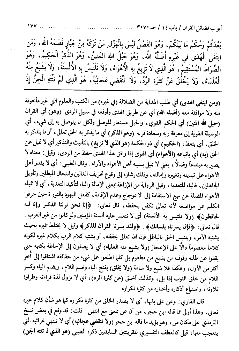 (وَمَنِ ابْتَغَى الْهُدَى) أَيْ طَلَبَ الْهِدَايَةَ مِنَ الضَّلَالَةِ (فِي غَيْرِهِ) مِنَ الْكُتُبِ وَالْعُلُومِ الَّتِي غَيْرُ مَأْخُوذَةٍ مِنْهُ وَلَا مُوَافِقَةٍ مَعَهُ (أَضَلَّهُ اللَّهُ) أَيْ عَنْ طَرِيقِ الْهُدَى وَأَوْقَعَهُ فِي سَبِيلِ الرَّدَى (وَهُوَ) أَيِ الْقُرْآنُ (حَبْلُ اللَّهِ الْمَتِينُ) أَيِ الْحُكْمُ الْقَوِيُّ وَالْحَبْلُ مُسْتَعَارٌ لِلْوَصْلِ وَلِكُلِّ مَا يُتَوَصَّلُ بِهِ إِلَى شَيْءٍ أَيِ الْوَسِيلَةُ الْقَوِيَّةُ إِلَى مَعْرِفَةِ رَبِّهِ وَسَعَادَةِ قُرْبِهِ (وَهُوَ الذِّكْرُ) أَيْ مَا يُذْكَرُ بِهِ الْحَقُّ تَعَالَى أَوْ مَا يَتَذَكَّرُ بِهِ الْخَلْقُ أَيْ يَتَّعِظُ (الْحَكِيمُ) أَيْ ذُو الْحِكْمَةِ (هُوَ الَّذِي لَا تَزِيغُ) بِالتَّأْنِيثِ وَالتَّذْكِيرِ أَيْ لَا تَمِيلُ عَنِ الْحَقِّ (بِهِ) أَيْ بِاتِّبَاعِهِ (الْأَهْوَاءُ) أَيِ الْهَوَى إِذَا وَافَقَ هَذَا الْهُدَى حُفِظَ مِنَ الرَّدَى وَقِيلَ مَعْنَاهُ لَا يَصِيرُ بِهِ مُبْتَدِعًا وَضَالًّا يَعْنِي لَا يَمِيلُ بِسَبَبِهِ أَهْلُ الْأَهْوَاءِ وَالْآرَاءِ