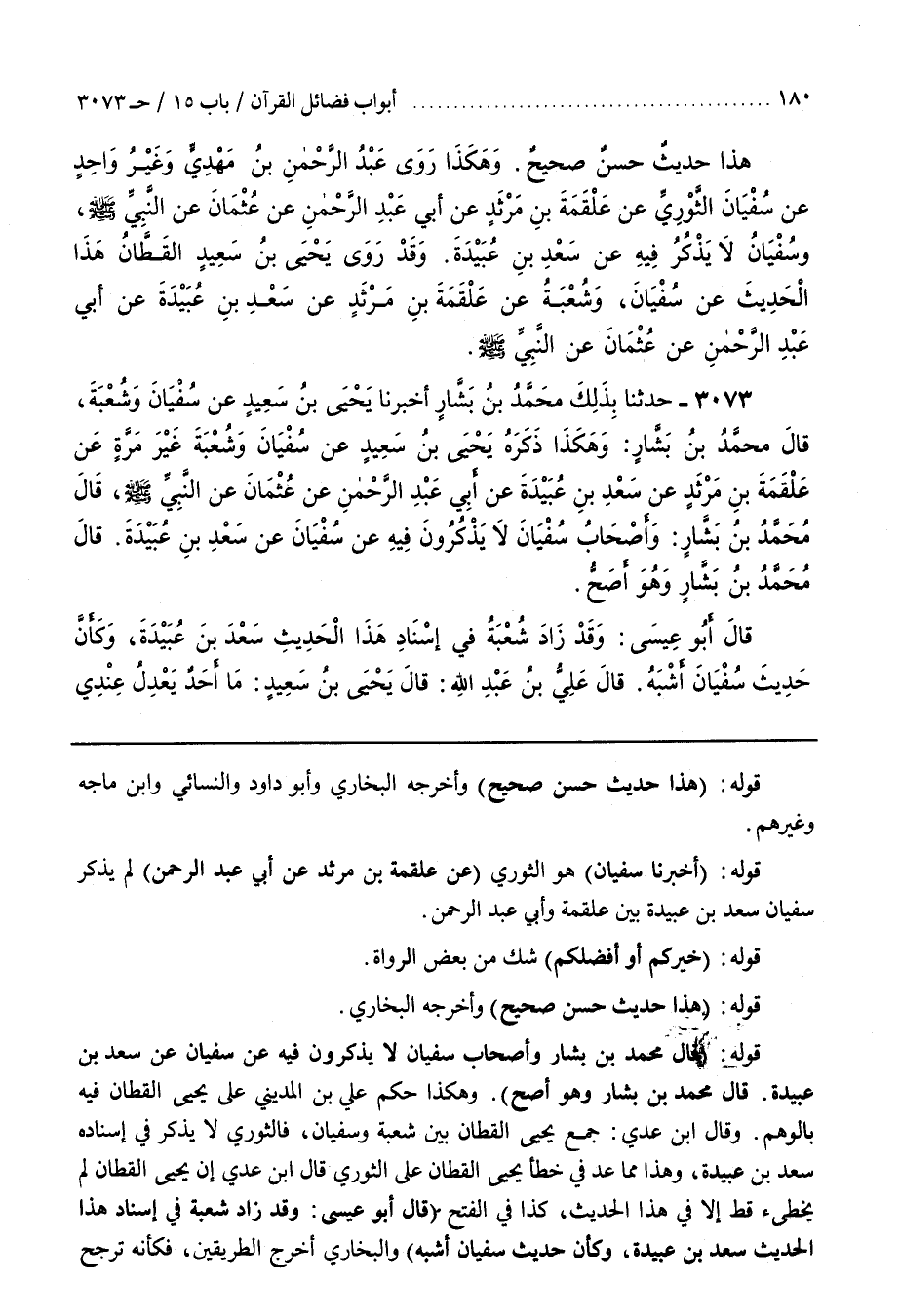 وقال أَبُو عِيسَى (وَقَدْ زَادَ شُعْبَةُ فِي إِسْنَادِ هَذَا الْحَدِيثِ سَعْدَ بْنَ عُبَيْدَةَ وَكَانَ حَدِيثُ سُفْيَانَ أَشْبَهَ) وَالْبُخَارِيُّ أَخْرَجَ الطَّرِيقَيْنِ فَكَأَنَّهُ تَرَجَّحَ