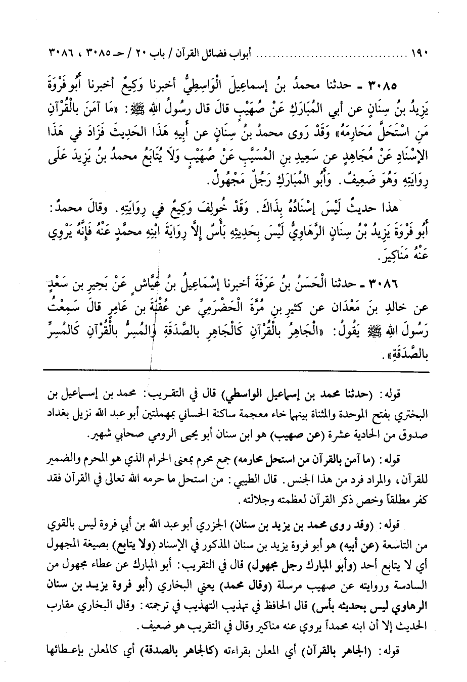 قَوْلُهُ (حَدَّثَنَا مُحَمَّدُ بْنُ إِسْمَاعِيلَ الْوَاسِطِيُّ) قَالَ فِي التَّقْرِيبِ مُحَمَّدُ بْنُ إِسْمَاعِيلَ بْنِ الْبَخْتَرِيِّ بِفَتْحِ الْمُوَحَّدَةِ وَالْمُثَنَّاةِ بَيْنَهُمَا خَاءٌ مُعْجَمَةٌ سَاكِنَةٌ الْحَسَّانِيُّ بِمُهْمَلَتَيْنِ أَبُو عَبْدِ اللَّهِ نَزِيلُ بَغْدَادَ صَدُوقٌ مِنَ الْحَادِيَةَ عَشْرَةَ (عَنْ صُهَيْبٍ) هُوَ بن سِنَانٍ أَبُو يَحْيَى الرُّومِيُّ صَحَابِيٌّ شَهِيرٌ قَوْلُهُ (مَا آمَنَ بِالْقُرْآنِ مَنِ اسْتَحَلَّ مَحَارِمَهُ) جَمْعُ مَحْرَمٍ بِمَعْنَى الْحَرَامِ الَّذِي هُوَ الْمُحَرَّمُ وَالضَّمِيرُ لِلْقُرْآنِ وَالْمُرَادُ فَرْدٌ مِنْ هَذَا الْجِنْسِ قَالَ الطِّيبِيُّ مَنِ اسْتَحَلَّ مَا حَرَّمَهُ اللَّهُ تَعَالَى فِي الْقُرْآنِ فَقَدْ كَفَرَ مُطْلَقًا وَخَصَّ ذِكْرَ الْقُرْآنِ لِعَظَمَتِهِ وَجَلَالَتِهِ قَوْلُهُ (وَقَدْ رَوَى مُحَمَّدُ بْنُ يَزِيدَ بْنِ سِنَانٍ) الْجَزَرِيُّ أَبُو عَبْدِ اللَّهِ بْنِ أَبِي فَرْوَةَ لَيْسَ بِالْقَوِيِّ مِنَ التَّاسِعَةِ (عَنْ أَبِيهِ) هُوَ أَبُو فَرْوَةَ يَزِيدُ بْنُ سِنَانٍ الْمَذْكُورُ فِي الْإِسْنَادِ (وَلَا يُتَابَعُ) بِصِيغَةِ الْمَجْهُولِ أَيْ لَا يُتَابَعُ أَحَدٌ (وَأَبُو الْمُبَارَكِ رَجُلٌ مَجْهُولٌ) قَالَ فِي التَّقْرِيبِ أَبُو الْمُبَارَكِ عَنْ عَطَاءٍ مَجْهُولٌ مِنَ السَّادِسَةِ وَرِوَايَتُهُ عَنْ صُهَيْبٍ مُرْسَلَةٌ (وَقَالَ مُحَمَّدٌ) يَعْنِي الْبُخَارِيَّ (أَبُو فَرْوَةَ يَزِيدُ بْنُ سِنَانٍ الرَّهَاوِيُّ لَيْسَ بِحَدِيثِهِ بَأْسٌ) قَالَ الْحَافِظُ فِي تَهْذِيبِ التَّهْذِيبِ فِي تَرْجَمَتِهِ وَقَالَ الْبُخَارِيُّ مُقَارِبُ الْحَدِيثِ إِلَّا أَنَّ ابْنَهُ مُحَمَّدًا يَرْوِي عَنْهُ مَنَاكِيرَ وَقَالَ فِي التَّقْرِيبِ هُوَ ضَعِيفٌ قَوْلُهُ (الْجَاهِرُ بِالْقُرْآنِ) أَيِ الْمُعْلِنُ بِقِرَاءَتِهِ (كَالْجَاهِرِ بِالصَّدَقَةِ) أَيْ كَالْمُعْلِنِ باعطائها