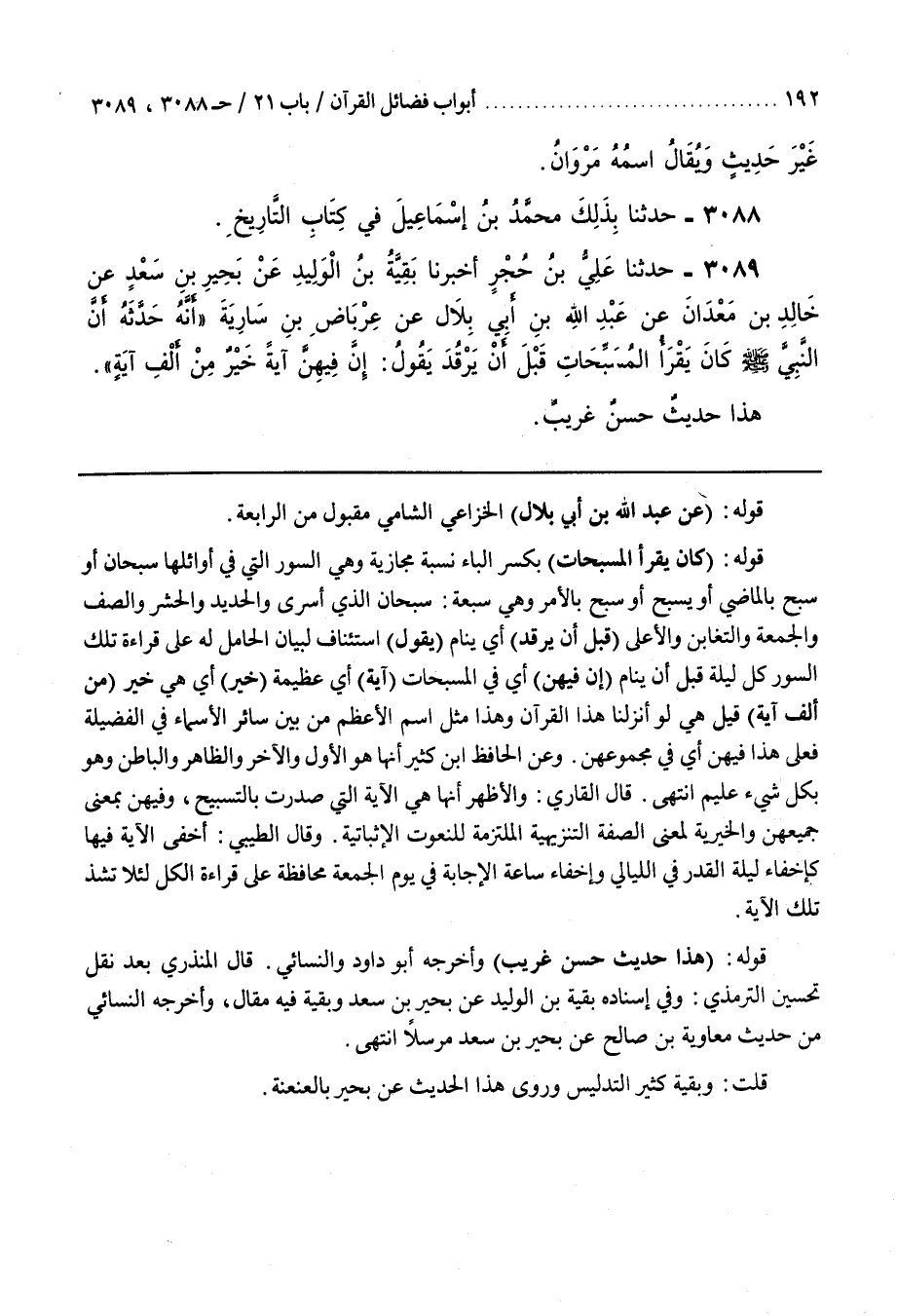 قَوْلُهُ (عَنْ عَبْدِ اللَّهِ بْنِ أَبِي بِلَالٍ) الْخُزَاعِيِّ الشَّامِيِّ مَقْبُولٌ مِنَ الرَّابِعَةِ قَوْلُهُ (كَانَ يَقْرَأُ الْمُسَبِّحَاتِ) بِكَسْرِ الْبَاءِ نِسْبَةٌ مَجَازِيَّةٌ وَهِيَ السُّوَرُ الَّتِي فِي أَوَائِلِهَا سُبْحَانَ أَوْ سَبَّحَ بِالْمَاضِي أَوْ يُسَبِّحُ أَوْ سَبِّحْ بِالْأَمْرِ وَهِيَ سبعة سبحان الذي أسرى وَالْحَدِيدُ وَالْحَشْرُ وَالصَّفُّ وَالْجُمُعَةُ وَالتَّغَابُنُ وَالْأَعْلَى (قَبْلَ أَنْ يَرْقُدَ) أَيْ يَنَامَ (يَقُولُ) اسْتِئْنَافٌ لِبَيَانِ الْحَامِلِ لَهُ عَلَى قِرَاءَةِ تِلْكَ السُّوَرِ كُلَّ لَيْلَةٍ قَبْلَ أَنْ يَنَامَ (إِنَّ فِيهِنَّ) أَيْ فِي الْمُسَبِّحَاتِ (آيَةً) أَيْ عَظِيمَةً (خَيْرٌ) أَيْ هِيَ خَيْرٌ (مِنْ أَلْفِ آيَةٍ) قِيلَ هِيَ {لو أنزلنا هذا القرآن} وَهَذَا مِثْلُ اسْمِ الْأَعْظَمِ مِنْ بَيْنِ سَائِرِ الْأَسْمَاءِ فِي الْفَضِيلَةِ فَعَلَى هَذَا فِيهِنَّ أَيْ في مجموعهن وعن الحافظ بن كثير أنها هُوَ الْأَوَّلُ وَالْآخِرُ وَالظَّاهِرُ وَالْبَاطِنُ وَهُوَ بِكُلِّ شيء عليم انتهى قال القارىء وَالْأَظْهَرُ أَنَّهَا هِيَ الْآيَةُ الَّتِي صُدِّرَتْ بِالتَّسْبِيحِ وفيهن بِمَعْنَى جَمِيعُهُنَّ وَالْخَيْرِيَّةُ لِمَعْنَى الصِّفَةِ التَّنْزِيهِيَّةِ الْمُلْتَزِمَةِ لِلنُّعُوتِ الْإِثْبَاتِيَّةِ وَقَالَ الطِّيبِيُّ أَخْفَى الْآيَةَ فِيهَا كَإِخْفَاءِ لَيْلَةِ الْقَدْرِ فِي اللَّيَالِي وَإِخْفَاءِ سَاعَةِ الْإِجَابَةِ فِي يَوْمِ الْجُمْعَةِ مُحَافَظَةً عَلَى قِرَاءَةِ الْكُلِّ لِئَلَّا تَشِذَّ تِلْكَ الْآيَةُ قَوْلُهُ (هَذَا حَدِيثٌ حَسَنٌ غَرِيبٌ) وَأَخْرَجَهُ أَبُو دَاوُدَ وَالنَّسَائِيُّ قَالَ الْمُنْذِرِيُّ بَعْدَ نَقْلِ تَحْسِينِ التِّرْمِذِيِّ وَفِي إِسْنَادِهِ بَقِيَّةُ بْنُ الْوَلِيدِ عَنْ بَحِيرِ بْنِ سَعْدٍ وَبَقِيَّةُ فِيهِ مَقَالٌ وَأَخْرَجَهُ النَّسَائِيُّ مِنْ حَدِيثِ مُعَاوِيَةَ بْنِ صَالِحٍ عَنْ بَحِيرِ بْنِ سَعْدٍ مُرْسَلًا انْتَهَى قُلْتُ وَبَقِيَّةُ كَثِيرُ التَّدْلِيسِ وروى هذا الحديث عن بحير بالعنعنة