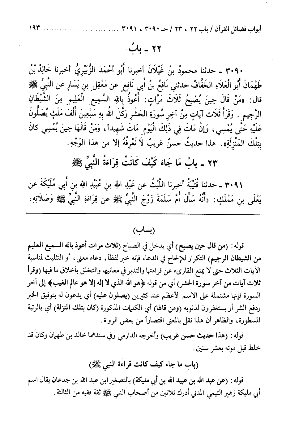 قَوْلُهُ (مَنْ قَالَ حِينَ يُصْبِحُ) أَيْ يَدْخُلُ فِي الصَّبَاحِ (ثَلَاثَ مَرَّاتٍ أَعُوذُ بِاَللَّهِ السَّمِيعِ الْعَلِيمِ مِنَ الشَّيْطَانِ الرَّجِيمِ) التَّكْرَارُ لِلْإِلْحَاحِ فِي الدُّعَاءِ فَإِنَّهُ خَبَرٌ لَفْظًا دُعَاءٌ مَعْنًى أَوِ التَّثْلِيثُ لِمُنَاسَبَةِ الْآيَاتِ الثَّلَاثِ حَتَّى لَا يُمْنَعَ القارىء عَنْ قِرَاءَتِهَا وَالتَّدَبُّرِ فِي مَعَانِيهَا وَالتَّخَلُّقِ بِأَخْلَاقِ مَا فِيهَا (وَقَرَأَ ثَلَاثَ آيَاتٍ مِنْ آخِرِ سُورَةِ الْحَشْرِ) أَيْ مِنْ قَوْلِهِ {هُوَ اللَّهُ الَّذِي لَا إِلَهَ إِلَّا هُوَ عَالِمُ الْغَيْبِ} إِلَى آخِرِ السُّورَةِ فَإِنَّهَا مُشْتَمِلَةٌ عَلَى الِاسْمِ الأعظم عند كثيرين (يصلون عليه) أي يَدْعُونَ لَهُ بِتَوْفِيقِ الْخَيْرِ وَدَفْعِ الشَّرِّ أَوْ يَسْتَغْفِرُونَ لِذُنُوبِهِ (وَمَنْ قَالَهَا) أَيِ الْكَلِمَاتِ الْمَذْكُورَةَ (كَانَ بِتِلْكَ الْمَنْزِلَةِ) أَيْ بِالرُّتْبَةِ الْمَسْطُورَةِ وَالظَّاهِرُ أَنَّ هَذَا نَقْلٌ بِالْمَعْنَى اقْتِصَارًا مِنْ بَعْضِ الرُّوَاةِ قَوْلُهُ (هَذَا حَدِيثٌ حَسَنٌ غَرِيبٌ) وَأَخْرَجَهُ الدَّارِمِيُّ وَفِي سَنَدِهِمَا خَالِدُ بْنُ طَهْمَانَ وَكَانَ قَدْ خَلَطَ قَبْلَ مَوْتِهِ بِعَشْرِ سِنِينَ