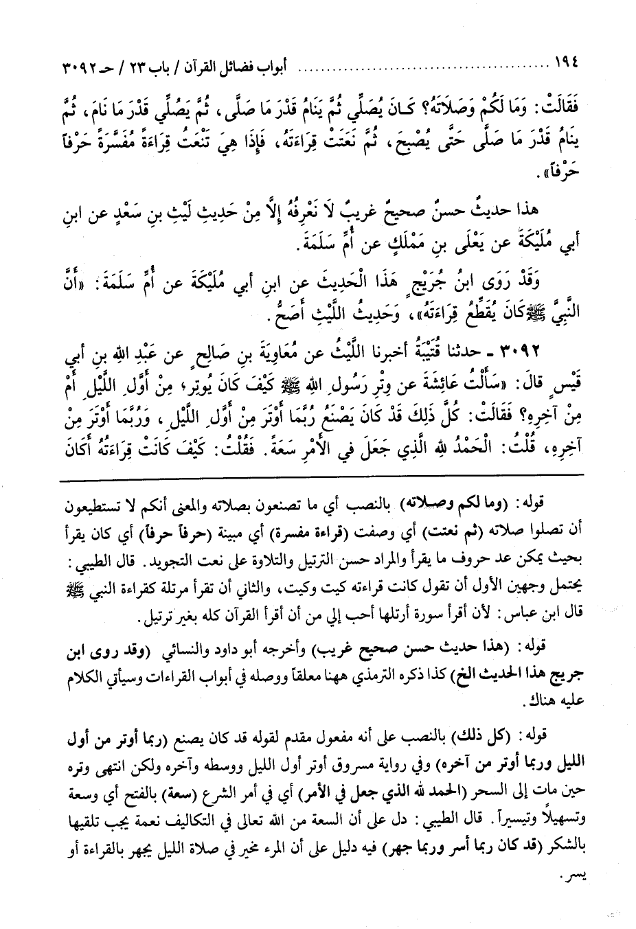 قوله (ومالكم وَصَلَاتَهُ) بِالنَّصْبِ أَيْ مَا تَصْنَعُونَ بِصَلَاتِهِ وَالْمَعْنَى أَنَّكُمْ لَا تَسْتَطِيعُونَ أَنْ تُصَلُّوا صَلَاتَهُ (ثُمَّ نَعَتَتْ) أَيْ وَصَفَتْ (قِرَاءَةً مُفَسَّرَةً) أَيْ مُبَيَّنَةً (حَرْفًا حَرْفًا) أَيْ كَانَ يَقْرَأُ بِحَيْثُ يُمْكِنُ عَدُّ حُرُوفِ مَا يَقْرَأُ وَالْمُرَادُ حُسْنُ التَّرْتِيلِ وَالتِّلَاوَةِ عَلَى نَعْتِ التَّجْوِيدِ قَالَ الطِّيبِيُّ يَحْتَمِلُ وَجْهَيْنِ الْأَوَّلُ أَنْ تَقُولَ كَانَتْ قِرَاءَتُهُ كَيْتَ وَكَيْتَ وَالثَّانِي أَنْ تَقْرَأَ مُرَتِّلَةً كَقِرَاءَةِ النَّبِيِّ صلى الله عليه وسلم قال بن عَبَّاسٍ لَأَنْ أَقْرَأَ سُورَةً أُرَتِّلُهَا أَحَبُّ إِلَيَّ مِنْ أَنْ أَقْرَأَ الْقُرْآنَ كُلَّهُ بِغَيْرِ تَرْتِيلٍ قَوْلُهُ (هَذَا حَدِيثٌ حَسَنٌ صَحِيحٌ غَرِيبٌ) وَأَخْرَجَهُ أبو داود والنسائي (وقد روى بن جُرَيْجٍ هَذَا الْحَدِيثَ إِلَخْ) كَذَا ذَكَرَهُ التِّرْمِذِيُّ ها هنا مُعَلَّقًا وَوَصَلَهُ فِي أَبْوَابِ الْقِرَاءَاتِ وَسَيَأْتِي الْكَلَامُ عَلَيْهِ هُنَاكَ قَوْلُهُ (كُلَّ ذَلِكَ) بِالنَّصْبِ عَلَى أَنَّهُ مَفْعُولٌ مُقَدَّمٌ لِقَوْلِهِ قَدْ كَانَ يَصْنَعُ (رُبَّمَا أَوْتَرَ مِنْ أَوَّلِ اللَّيْلِ وَرُبَّمَا أَوْتَرَ مِنْ آخِرِهِ) وَفِي رِوَايَةِ مَسْرُوقٍ أَوْتَرَ أَوَّلَ اللَّيْلِ وَوَسَطَهُ وَآخِرَهُ وَلَكِنِ انْتَهَى وِتْرُهُ حِينَ مَاتَ إِلَى السَّحَرِ (الْحَمْدُ لِلَّهِ الَّذِي جَعَلَ فِي الْأَمْرِ) أَيْ فِي أَمْرِ الشَّرْعِ (سَعَةً) بِالْفَتْحِ أَيْ وَسَعَةً وَتَسْهِيلًا وَتَيْسِيرًا قَالَ الطِّيبِيُّ دَلَّ عَلَى أَنَّ السَّعَةَ مِنَ اللَّهِ تَعَالَى فِي التَّكَالِيفِ نِعْمَةٌ يَجِبُ تَلَقِّيهَا بِالشُّكْرِ (قَدْ كَانَ رُبَّمَا أَسَرَّ وَرُبَّمَا جَهَرَ) فِيهِ دَلِيلٌ عَلَى أَنَّ الْمَرْءَ مُخَيَّرٌ فِي صَلَاةِ اللَّيْلِ يَجْهَرُ بِالْقِرَاءَةِ أَوْ يُسِرُّ