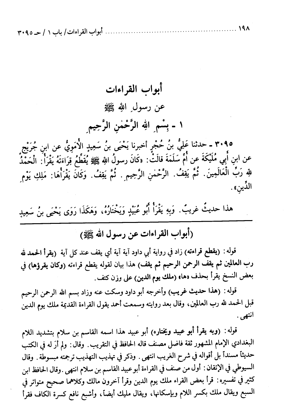 قَوْلُهُ (يُقَطِّعُ قِرَاءَتَهُ) زَادَ فِي رِوَايَةِ أَبِي دَاوُدَ آيَةً آيَةً أَيْ يَقِفُ عِنْدَ كُلِّ آية (يقرأ الحمد لله رب العالمين ثم يقف الرحمن الرحيم ثُمَّ يَقِفُ) هَذَا بَيَانٌ لِقَوْلِهِ يُقَطِّعُ قِرَاءَتَهُ (وَكَانَ يَقْرَؤُهَا) فِي بَعْضِ النُّسَخِ يَقْرَأُ بِحَذْفِهَا (ملك يَوْمِ الدِّينِ) عَلَى وَزْنِ كَتِفٍ قَوْلُهُ (هَذَا حَدِيثٌ غَرِيبٌ) وَأَخْرَجَهُ أَبُو دَاوُدَ وَسَكَتَ عَنْهُ وزاد بسم الله الرحمن الرحيم قبل الحمد لله رب العالمين وَقَالَ بَعْدَ رِوَايَتِهِ وَسَمِعْتُ أَحْمَدَ يَقُولُ الْقِرَاءَةُ القديمة مالك يوم الدين انْتَهَى قَوْلُهُ (وَبِهِ يَقْرَأُ أَبُو عُبَيْدٍ وَيَخْتَارُهُ) أَبُو عُبَيْدٍ هَذَا اسْمُهُ الْقَاسِمُ بْنُ سَلَّامٍ بِتَشْدِيدِ اللَّامِ الْبَغْدَادِيُّ الْإِمَامُ الْمَشْهُورُ ثِقَةٌ فَاضِلٌ مُصَنِّفٌ قَالَهُ الْحَافِظُ فِي التَّقْرِيبِ وَقَالَ وَلَمْ أَرَ لَهُ فِي الْكُتُبِ حَدِيثًا مُسْنَدًا بَلْ أَقْوَالُهُ فِي شَرْحِ الْغَرِيبِ انْتَهَى وَذَكَرَ فِي تَهْذِيبِ التَّهْذِيبِ تَرْجَمَتَهُ مَبْسُوطَةً وَقَالَ السُّيُوطِيُّ فِي الْإِتْقَانِ أَوَّلُ مَنْ صَنَّفَ فِي الْقِرَاءَةِ أَبُو عُبَيْدٍ الْقَاسِمُ بْنُ سَلَّامٍ انْتَهَى وَقَالَ الْحَافِظُ بن كَثِيرٍ فِي تَفْسِيرِهِ قَرَأَ بَعْضُ الْقُرَّاءِ مَلِكِ يَوْمِ الدِّينِ وَقَرَأَ آخَرُونَ مَالِكِ وَكِلَاهُمَا صَحِيحٌ مُتَوَاتِرٌ فِي السَّبْعِ وَيُقَالُ مَلِكِ بِكَسْرِ اللَّامِ وبإسكانهاويقال مليك أيضاوأشبع نافع كسرةالكاف فقرأ