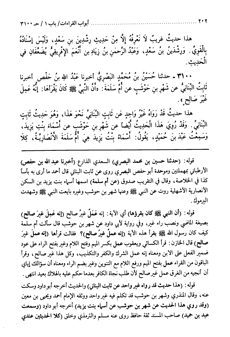 قَوْلُهُ (حَدَّثَنَا حُسَيْنُ بْنُ مُحَمَّدٍ الْبَصْرِيُّ) السَّعْدِيُّ الذَّارِعُ (أَخْبَرَنَا عَبْدُ اللَّهِ بْنُ حَفْصٍ) الْأَرْطَبَانِيُّ بِمُهْمَلَتَيْنِ وَمُوَحَّدَةٍ أَبُو حَفْصٍ الْبَصْرِيُّ رَوَى عَنْ ثَابِتٍ الْبُنَانِيِّ قَالَ أَحْمَدُ مَا أَرَى بِهِ بَأْسًا كَذَا فِي الْخُلَاصَةِ وَقَالَ فِي التَّقْرِيبِ صَدُوقٌ (عَنْ أُمِّ سَلَمَةَ) اسْمُهَا أَسْمَاءُ بِنْتُ يَزِيدَ بْنِ السَّكَنِ الْأَنْصَارِيَّةُ الْأَشْهَلِيَّةُ رَوَتْ عَنِ النَّبِيِّ صَلَّى اللَّهُ عَلَيْهِ وَسَلَّمَ وَعَنْهَا شَهْرُ بْنُ حَوْشَبٍ وَغَيْرُهُ بَايَعَتِ النَّبِيَّ صَلَّى اللَّهُ عَلَيْهِ وَسَلَّمَ وَشَهِدَتِ الْيَرْمُوكَ قَوْلُهُ (أَنَّ النَّبِيَّ صَلَّى اللَّهُ عَلَيْهِ وَسَلَّمَ كَانَ يَقْرَؤُهَا) أَيِ الاية {إنه عمل غير صالح} (إِنَّهُ عَمِلَ غَيْرَ صَالِحٍ) بِصِيغَةِ الْمَاضِي وَنَصْبِ رَاءِ غَيْرَ وَفِي رِوَايَةٍ لِأَبِي دَاوُدَ عَنْ شَهْرِ بْنِ حَوْشَبٍ قَالَ سَأَلْتُ أُمَّ سَلَمَةَ كَيْفَ كَانَ رَسُولُ اللَّهِ صَلَّى اللَّهُ عَلَيْهِ وَسَلَّمَ يَقْرَأُ هَذِهِ الْآيَةَ (إِنَّهُ عَمَلٌ غَيْرُ صالح) فَقَالَتْ قَرَأَهَا (إِنَّهُ عَمِلَ غَيْرَ صَالِحٍ) قَالَ الْخَازِنُ قَرَأَ الْكِسَائِيُّ وَيَعْقُوبُ عَمِلَ بِكَسْرِ الْمِيمِ وفتح اللام وغير بِفَتْحِ الرَّاءِ عَلَى عَوْدِ ضَمِيرِ الْفِعْلِ عَلَى الِابْنِ وَمَعْنَاهُ إِنَّهُ عَمِلَ الشِّرْكَ وَالْكُفْرَ وَالتَّكْذِيبَ وَكُلُّ هَذَا غَيْرُ صَالِحٍ وَقَرَأَ الْبَاقُونَ مِنَ الْقُرَّاءِ عَمَلٌ بِفَتْحِ الْمِيمِ وَرَفْعِ اللَّامِ مَعَ التَّنْوِينِ وَغَيْرُ بِضَمِّ الرَّاءِ وَمَعْنَاهُ أَنَّ سُؤَالَكَ إِيَّايَ أَنْ أُنْجِيَهُ مِنَ الْغَرَقِ عَمَلٌ غَيْرُ صالح لأن طلب نجاة الكافر بعد ما حُكِمَ عَلَيْهِ بِالْهَلَاكِ بَعِيدٌ انْتَهَى قَوْلُهُ (هَذَا حَدِيثٌ قَدْ رَوَاهُ غَيْرُ وَاحِدٍ عَنْ ثَابِتٍ الْبُنَانِيِّ) وَالْحَدِيثُ أَخْرَجَهُ أَبُو دَاوُدَ وَسَكَتَ عَنْهُ وَقَالَ الْمُنْذِرِيُّ وَشَهْرُ بْنُ حَوْشَبٍ قَدْ تَكَلَّمَ فِيهِ غَيْرُ وَاحِدٍ وَوَثَّقَهُ الْإِمَامُ أَحْمَدُ وَيَحْيَى بْنُ مَعِينٍ (وَقَدْ رُوِيَ هَذَا الْحَدِيثُ عَنْ شَهْرِ بْنِ حَوْشَبٍ عَنْ أَسْمَاءَ بِنْتِ يَزِيدَ) أَخْرَجَهُ أَبُو دَاوُدَ (وَسَمِعْتُ عَبْدَ بْنَ حُمَيْدٍ) صَاحِبَ الْمُسْنَدِ ثِقَةٌ حَافِظٌ رَوَى عَنْهُ مُسْلِمٌ وَالتِّرْمِذِيُّ وَخَلْقٌ (كِلَا الْحَدِيثَيْنِ عِنْدِي