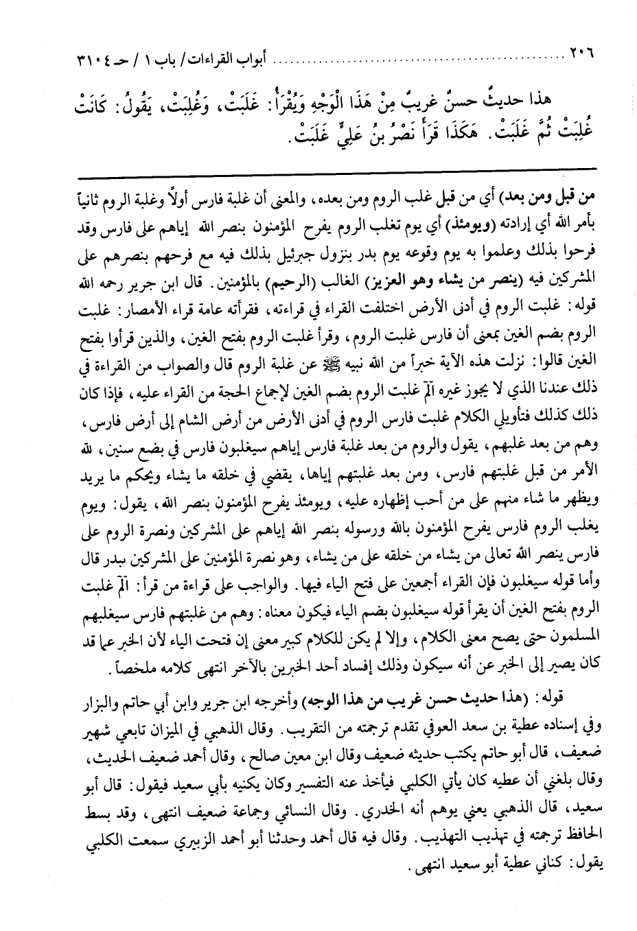 من قبل ومن بعد) أَيْ مِنْ قَبْلِ غَلَبِ الرُّومِ وَمِنْ بَعْدِهِ وَالْمَعْنَى أَنَّ غَلَبَةَ فَارِسَ أَوَّلًا وَغَلَبَةَ الرُّومِ ثَانِيًا بِأَمْرِ اللَّهِ أَيْ إِرَادَتِهِ (وَيَوْمَئِذٍ) أَيْ يوم تغلب الروم ويفرح المؤمنون بنصر الله إِيَّاهُمْ عَلَى فَارِسَ وَقَدْ فَرِحُوا بِذَلِكَ وَعَلِمُوا به يوم وقوعه يوم بدر بنزول جبرائيل بِذَلِكَ فِيهِ مَعَ فَرَحِهِمْ بِنَصْرِهِمْ عَلَى الْمُشْرِكِينَ فِيهِ (يَنْصُرُ مَنْ يَشَاءُ وَهُوَ الْعَزِيزُ) الْغَالِبُ (الرحيم) بالمؤمنين قال بن جَرِيرٍ رَحِمَهُ اللَّهُ قَوْلُهُ غُلِبَتِ الرُّومُ فِي أدنى الأرض اخْتَلَفَتِ الْقُرَّاءُ فِي قِرَاءَتِهِ فَقَرَأَتْهُ عَامَّةُ قُرَّاءِ الأمصار غلبت الروم بِضَمِّ الْغَيْنِ بِمَعْنَى أَنَّ فَارِسَ غَلَبَتِ الروم وقرأ غلبت الروم بفتح الغين والذين قرأوا بِفَتْحِ الْغَيْنِ قَالُوا نَزَلَتْ هَذِهِ الْآيَةُ خَبَرًا من الله نبيه صَلَّى اللَّهُ عَلَيْهِ وَسَلَّمَ عَنْ غَلَبَةِ الرُّومِ قَالَ وَالصَّوَابُ مِنَ الْقِرَاءَةِ فِي ذَلِكَ عِنْدَنَا الَّذِي لَا يَجُوزُ غَيْرُهُ الم غُلِبَتِ الرُّومُ بِضَمِّ الْغَيْنِ لِإِجْمَاعِ الْحُجَّةِ مِنَ الْقُرَّاءِ عَلَيْهِ فإذا كان ذلك كذلك فتأويلي الْكَلَامَ غَلَبَتْ فَارِسُ الرُّومَ فِي أَدْنَى الْأَرْضِ مِنْ أَرْضِ الشَّامِ إِلَى أَرْضِ فَارِسَ وَهُمْ مِنْ بَعْدِ غَلَبِهِمْ يَقُولُ وَالرُّومُ مِنْ بَعْدِ غَلَبَةِ فَارِسَ إِيَّاهُمْ سَيَغْلِبُونَ فَارِسَ فِي بِضْعِ سِنِينَ لِلَّهِ الْأَمْرُ مِنْ قَبْلِ غَلَبَتِهِمْ فَارِسَ وَمِنْ بَعْدِ غَلَبَتِهِمْ إِيَّاهَا يَقْضِي فِي خَلْقِهِ مَا يَشَاءُ وَيَحْكُمُ مَا يُرِيدُ وَيُظْهِرُ مَنْ شَاءَ مِنْهُمْ عَلَى مَنْ أَحَبَّ إِظْهَارَهُ عَلَيْهِ ويومئذ يفرح المؤمنون بنصر الله يَقُولُ وَيَوْمَ يَغْلِبُ الرُّومُ فَارِسَ يَفْرَحُ الْمُؤْمِنُونَ بِاَللَّهِ وَرَسُولِهُ بِنَصْرِ اللَّهِ إِيَّاهُمْ عَلَى الْمُشْرِكِينَ وَنُصْرَةِ الرُّومِ عَلَى فَارِسَ يَنْصُرُ اللَّهُ تَعَالَى مَنْ يَشَاءُ مِنْ خَلْقِهِ عَلَى مَنْ يَشَاءُ وَهُوَ نُصْرَةُ الْمُؤْمِنِينَ عَلَى الْمُشْرِكِينَ بِبَدْرٍ قَالَ وَأَمَّا قَوْلُهُ سَيَغْلِبُونَ فَإِنَّ الْقُرَّاءَ أَجْمَعِينَ عَلَى فَتْحِ الْيَاءِ فِيهَا وَالْوَاجِبُ عَلَى قِرَاءَةِ مَنْ قَرَأَ الم غَلَبَتِ الرُّومُ بِفَتْحِ الْغَيْنِ أَنْ يَقْرَأَ قَوْلَهُ سَيَغْلِبُونَ بِضَمِّ الْيَاءِ فَيَكُونَ مَعْنَاهُ وَهُمْ مِنْ غَلَبَتِهِمْ فَارِسَ سَيَغْلِبُهُمِ الْمُسْلِمُونَ حَتَّى يَصِحَّ مَعْنَى الْكَلَامِ وَإِلَّا لَمْ يَكُنْ لِلْكَلَامِ كَبِيرُ مَعْنًى إِنْ فُتِحَتِ الْيَاءُ لِأَنَّ الْخَبَرَ عَمَّا قَدْ كَانَ يَصِيرُ إِلَى الْخَبَرِ عَنْ أَنَّهُ سَيَكُونُ وَذَلِكَ إِفْسَادُ أَحَدِ الْخَبَرَيْنِ بِالْآخَرِ انْتَهَى كَلَامُهُ مُلَخَّصًا قَوْلُهُ (هَذَا حَدِيثٌ حَسَنٌ غَرِيبٌ مِنْ هَذَا الوجه) وأخرجه بن جرير وبن أَبِي حَاتِمٍ وَالْبَزَّارُ وَفِي إِسْنَادِهِ عَطِيَّةُ بْنُ سَعْدٍ الْعَوْفِيُّ تَقَدَّمَ تَرْجَمَتُهُ مِنَ التَّقْرِيبِ وَقَالَ الذَّهَبِيُّ فِي الْمِيزَانِ تَابِعِيٌّ شَهِيرٌ ضَعِيفٌ قَالَ أَبُو حاتم يكتب حديثه ضعيف وقال بن مَعِينٍ صَالِحٌ وَقَالَ أَحْمَدُ ضَعِيفُ الْحَدِيثِ وَقَالَ بَلَغَنِي أَنَّ عَطِيَّةَ كَانَ يَأْتِي الْكَلْبِيَّ فَيَأْخُذُ عَنْهُ التَّفْسِيرَ وَكَانَ يُكَنِّيه بِأَبِي سَعِيدٍ فَيَقُولُ قَالَ أَبُو سَعِيدٍ قَالَ الذَّهَبِيُّ يَعْنِي يُوهِمُ أَنَّهُ الْخُدْرِيُّ وَقَالَ النَّسَائِيُّ وَجَمَاعَةٌ ضَعِيفٌ انْتَهَى وَقَدْ بَسَطَ الْحَافِظُ تَرْجَمَتَهُ فِي تَهْذِيبِ التَّهْذِيبِ وَقَالَ فِيهِ قَالَ أَحْمَدُ وَحَدَّثَنَا أَبُو أَحْمَدَ الزُّبَيْرِيُّ سَمِعْتُ ا