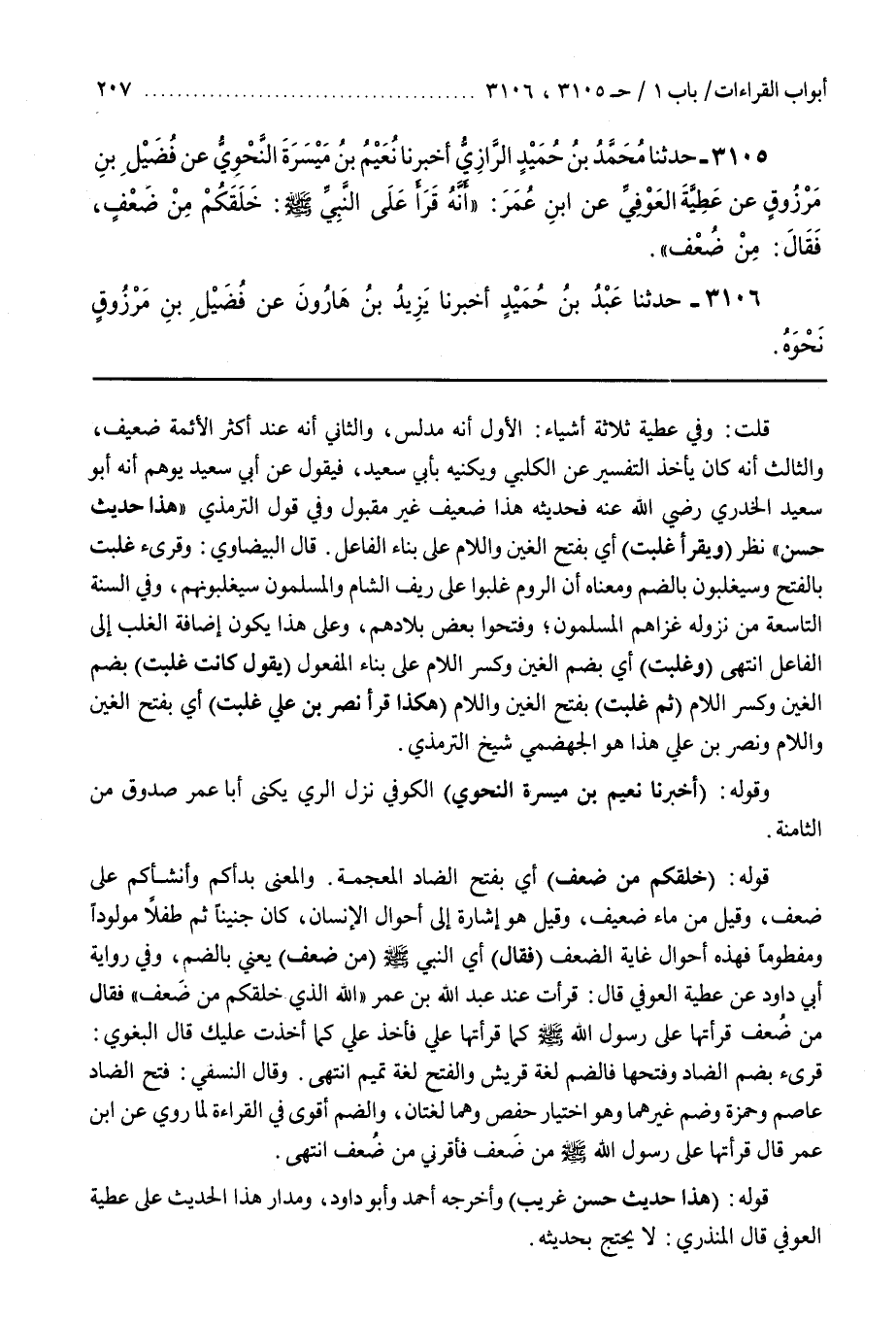 قُلْتُ وَفِي عَطِيَّةَ ثَلَاثَةُ أَشْيَاءَ الْأَوَّلُ أَنَّهُ مُدَلِّسٌ وَالثَّانِي أَنَّهُ عِنْدَ أَكْثَرِ الْأَئِمَّةِ ضَعِيفٌ وَالثَّالِثُ أَنَّهُ كَانَ يَأْخُذُ التَّفْسِيرَ عَنِ الْكَلْبِيِّ وَيُكَنِّيه بِأَبِي سَعِيدٍ فَيَقُولُ عَنْ أَبِي سَعِيدٍ يُوهِمُ أَنَّهُ أَبُو سَعِيدٍ الْخُدْرِيُّ رَضِيَ اللَّهُ عَنْهُ فَحَدِيثُهُ هَذَا ضَعِيفٌ غَيْرُ مَقْبُولٍ وَفِي قَوْلِ التِّرْمِذِيِّ هَذَا حَدِيثٌ حَسَنٌ نَظَرٌ (وَيُقْرَأُ غَلَبَتْ) أَيْ بِفَتْحِ الْغَيْنِ وَاللَّامِ عَلَى بِنَاءِ الفاعل قال البيضاوي وقرىء غَلَبَتْ بِالْفَتْحِ وَسَيُغْلَبُونَ بِالضَّمِّ وَمَعْنَاهُ أَنَّ الرُّومَ غَلَبُوا عَلَى رِيفِ الشَّامِ وَالْمُسْلِمُونَ سَيَغْلِبُونَهُمْ وَفِي السَّنَةِ التَّاسِعَةِ مِنْ نُزُولِهِ غَزَاهُمِ الْمُسْلِمُونَ وَفَتَحُوا بَعْضَ بِلَادِهِمْ وَعَلَى هَذَا يَكُونُ إِضَافَةُ الْغَلَبِ إِلَى الْفَاعِلِ انْتَهَى (وَغُلِبَتْ) أَيْ بِضَمِّ الْغَيْنِ وَكَسْرِ اللَّامِ عَلَى بِنَاءِ الْمَفْعُولِ (يَقُولُ كَانَتْ غُلِبَتْ) بِضَمِّ الْغَيْنِ وَكَسْرِ اللَّامِ (ثُمَّ غَلَبَتْ) بِفَتْحِ الْغَيْنِ وَاللَّامِ (هَكَذَا قَرَأَ نَصْرُ بْنُ عَلِيٍّ غَلَبَتْ) أَيْ بِفَتْحِ الْغَيْنِ وَاللَّامِ وَنَصْرُ بْنُ عَلِيٍّ هَذَا هُوَ الْجَهْضَمِيُّ شَيْخُ التِّرْمِذِيِّ قَوْلُهُ (أَخْبَرَنَا نُعَيْمُ بْنُ مَيْسَرَةَ النَّحْوِيُّ) الْكُوفِيُّ نَزَلَ الرِّيَّ يُكَنَّى أَبَا عُمَرَ صَدُوقٌ مِنَ الثامنة قوله (خلقكم من ضعف) أَيْ بِفَتْحِ الضَّادِ الْمُعْجَمَةِ وَالْمَعْنَى بَدَأَكُمْ وَأَنْشَأَكُمْ عَلَى ضَعْفٍ وَقِيلَ مِنْ مَاءٍ ضَعِيفٍ وَقِيلَ هُوَ إِشَارَةٌ إِلَى أَحْوَالِ الْإِنْسَانِ كَانَ جَنِينًا ثُمَّ طِفْلًا مَوْلُودًا وَمَفْطُومًا فَهَذِهِ أَحْوَالُ غَايَةِ الضَّعْفِ (فَقَالَ) أَيْ النَّبِيُّ صَلَّى اللَّهُ عَلَيْهِ وَسَلَّمَ مِنْ ضُعْفٍ يَعْنِي بِالضَّمِّ وَفِي رِوَايَةِ أَبِي دَاوُدَ عَنْ عَطِيَّةَ الْعَوْفِيِّ قَالَ قَرَأْتَ عِنْدَ عَبْدِ اللَّهِ بْنِ عُمَرَ {اللَّهُ الَّذِي خَلَقَكُمْ مِنْ ضَعْفٍ} فَقَالَ مِنْ ضُعْفٍ قَرَأْتُهَا عَلَى رَسُولِ اللَّهِ صَلَّى اللَّهُ عَلَيْهِ وَسَلَّمَ كَمَا قَرَأْتَهَا عَلَيَّ فَأَخَذَ عَلَيَّ كَمَا أَخَذْتُ عَلَيْكَ قَالَ الْبَغَوِيُّ قُرِئَ بِضَمِّ الضَّادِ وَفَتْحِهَا فَالضَّمُّ لُغَةُ قُرَيْشٍ وَالْفَتْحُ لُغَةُ تَمِيمٍ انْتَهَى وَقَالَ النَّسَفِيُّ فَتَحَ الضَّادَ عَاصِمٌ وَحَمْزَةُ وَضَمَّ غَيْرُهُمَا وَهُوَ اخْتِيَارُ حَفْصٍ وَهُمَا لُغَتَانِ وَالضَّمُّ أقوى في القراءة لما روى عن بن عُمَرَ قَالَ قَرَأْتُهَا عَلَى رَسُولِ اللَّهِ صَلَّى الله عليه وسلم من ضعف فأقرني مِنْ ضُعْفٍ انْتَهَى قَوْلُهُ (هَذَا حَدِيثٌ حَسَنٌ غَرِيبٌ) وَأَخْرَجَهُ أَحْمَدُ وَأَبُو دَاوُدَ وَمَدَارُ هَذَا الْحَدِيثِ عَلَى عَطِيَّةَ الْعَوْفِيِّ قَالَ الْمُنْذِرِيُّ لَا يحتج بحديثه