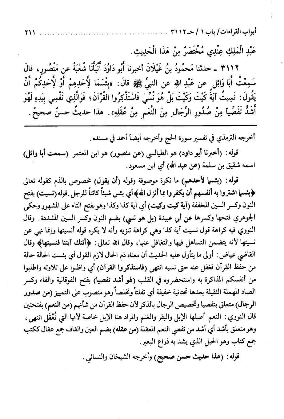 قَوْلُهُ (أَخْبَرَنَا أَبُو دَاوُدَ) هُوَ الطَّيَالِسِيُّ (عَنْ منصور) هو بن الْمُعْتَمِرِ (سَمِعْتُ أَبَا وَائِلٍ) اسْمُهُ شَقِيقُ بْنُ سلمة (عن عبد الله) أي بن مسعود قوله (بئسما لِأَحَدِهِمْ) مَا نَكِرَةٌ مَوْصُوفَةٌ وَقَوْلُهُ (أَنْ يَقُولَ) مَخْصُوصٌ بِالذَّمِّ كَقَوْلِهِ تَعَالَى {بِئْسَمَا اشْتَرَوْا بِهِ أنفسهم أن يكفروا بما أنزل الله} أَيْ بِئْسَ شَيْئًا كَائِنًا لِلرَّجُلِ قَوْلُهُ (نَسِيتُ) بِفَتْحِ النُّونِ وَكَسْرِ السِّينِ الْمُخَفَّفَةِ (آيَةَ كَيْتَ وَكَيْتَ) أَيْ آيَةَ كَذَا وَكَذَا وَهُوَ بِفَتْحِ التَّاءِ عَلَى الْمَشْهُورِ وَحَكَى الْجَوْهَرِيُّ فَتْحَهَا وَكَسْرَهَا عَنْ أَبِي عُبَيْدَةَ (بَلْ هُوَ نُسِّيَ) بِضَمِّ النُّونِ وَكَسْرِ السِّينِ الْمُشَدَّدَةِ وَقَالَ النَّوَوِيُّ فِيهِ كَرَاهَةُ قَوْلِ نَسِيتُ آيَةَ كَذَا وَهِيَ كَرَاهَةُ تَنْزِيهٍ وَأَنَّهُ لَا يُكْرَهُ قَوْلُهُ أُنْسِيتُهَا وَإِنَّمَا نَهَى عَنْ نَسِيتُهَا لِأَنَّهُ يَتَضَمَّنُ التَّسَاهُلَ فِيهَا والتغافل عنها وقال الله تعالى {أتتك آيتنا فَنَسِيتَهَا} وَقَالَ الْقَاضِي عِيَاضٌ أَوْلَى مَا يُتَأَوَّلُ عليه الحديث أن معناه ذم الحال لازم القول أي بئست الْحَالَةُ حَالَةَ مَنْ حَفِظَ الْقُرْآنَ فَغَفَلَ عَنْهُ حَتَّى نَسِيَهُ انْتَهَى (فَاسْتَذْكِرُوا الْقُرْآنَ) أَيْ وَاظِبُوا عَلَى تِلَاوَتِهِ وَاطْلُبُوا مِنْ أَنْفُسِكُمِ الْمُذَاكَرَةَ بِهِ وَاسْتَحْضِرُوهُ فِي الْقَلْبِ (لَهُوَ أَشَدُّ تَفَصِّيًا) بِفَتْحِ الْفَوْقَانِيَّةِ وَالْفَاءِ وَكَسْرِ الصَّادِ الْمُهْمَلَةِ الثَّقِيلَةِ بَعْدَهَا تَحْتَانِيَّةٌ خَفِيفَةٌ أَيْ تَفَلُّتًا وَتَخَلُّصًا وَهُوَ مَنْصُوبٌ على التمييز (من صدور الرجال) متعلق بتفصيا وَتَخْصِيصُ الرِّجَالِ بِالذِّكْرِ لِأَنَّ حِفْظَ الْقُرْآنِ مِنْ شَأْنِهِمْ (مِنَ النَّعَمِ) بِفَتْحَتَيْنِ قَالَ النَّوَوِيُّ النَّعَمُ أَصْلُهَا الْإِبِلُ وَالْبَقَرُ وَالْغَنَمُ وَالْمُرَادُ هُنَا الْإِبِلُ خَاصَّةً لِأَنَّهَا الَّتِي تُعْقَلُ انْتَهَى وَهُوَ مُتَعَلِّقٌ بأشد أَيْ أَشَدُّ مِنْ تَفَصِّي النَّعَمِ الْمُعَقَّلَةِ (مِنْ عُقُلِهِ) بِضَمِّ الْعَيْنِ وَالْقَافِ جَمْعُ عِقَالٍ كَكُتُبٍ جَمْعُ كِتَابٍ وَهُوَ الْحَبْلُ الَّذِي يُشَدُّ بِهِ ذِرَاعُ الْبَعِيرِ قَوْلُهُ (هَذَا حَدِيثٌ حَسَنٌ صَحِيحٌ) وَأَخْرَجَهُ الشَّيْخَانِ وَالنَّسَائِيُّ