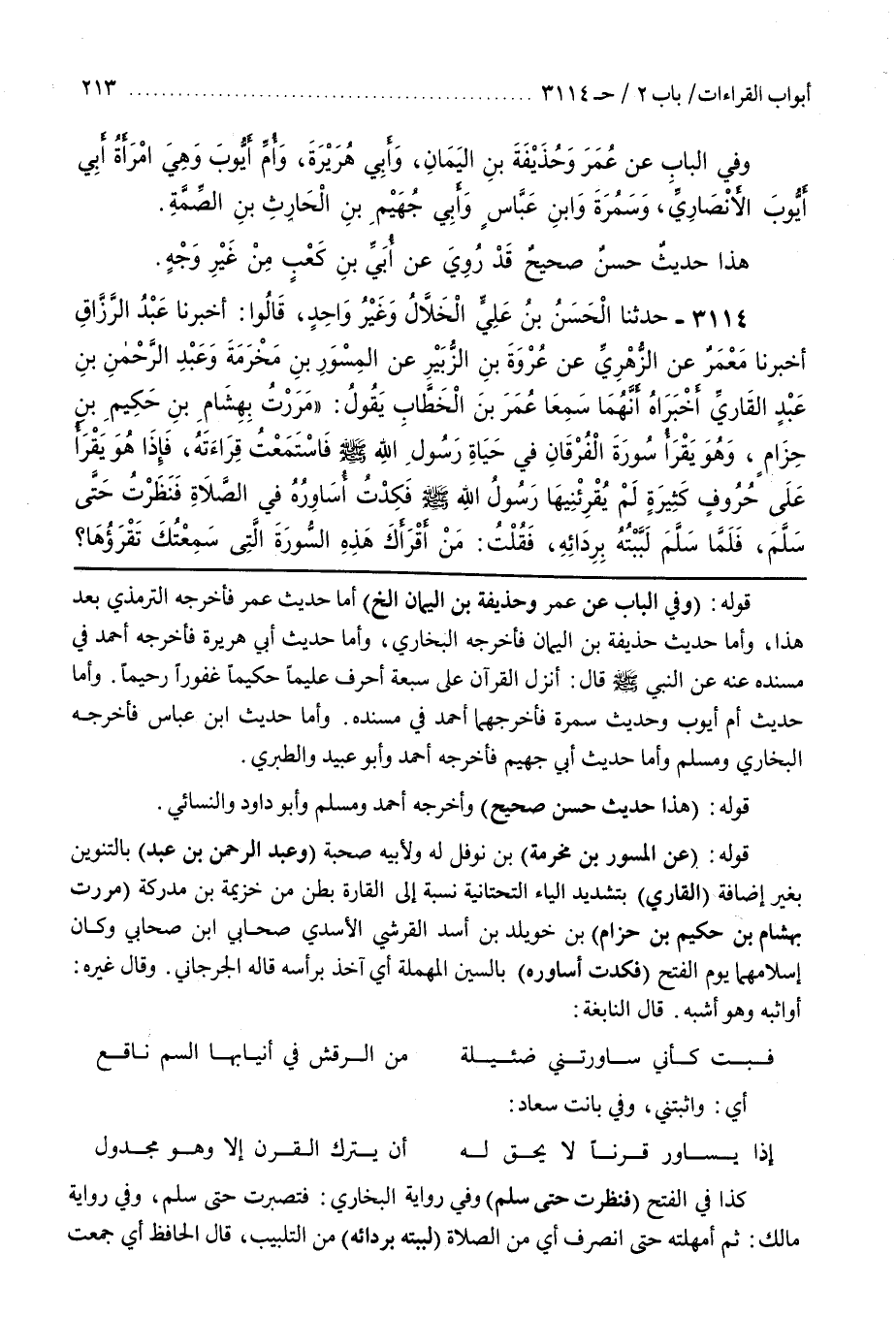 قَوْلُهُ (وَفِي الْبَابِ عَنْ عُمَرَ وَحُذَيْفَةَ بْنِ الْيَمَانِ إِلَخْ) أَمَّا حَدِيثُ عُمَرَ فَأَخْرَجَهُ التِّرْمِذِيُّ بَعْدَ هَذَا وَأَمَّا حَدِيثُ حُذَيْفَةَ بْنِ الْيَمَانِ فَأَخْرَجَهُ الْبُخَارِيُّ وَأَمَّا حَدِيثُ أَبِي هُرَيْرَةَ فَأَخْرَجَهُ أَحْمَدُ فِي مُسْنَدِهِ عَنْهُ عَنِ النَّبِيِّ صَلَّى اللَّهُ عَلَيْهِ وَسَلَّمَ قَالَ أُنْزِلَ الْقُرْآنُ عَلَى سَبْعَةِ أَحْرُفٍ عَلِيمًا حَكِيمًا غَفُورًا رَحِيمًا وَأَمَّا حديث أم أيوب وحديث سمرة فأخرجها أحمد في مسنده وأما حديث بن عَبَّاسٍ فَأَخْرَجَهُ الْبُخَارِيُّ وَمُسْلِمٌ وَأَمَّا حَدِيثُ أَبِي جُهَيْمٍ فَأَخْرَجَهُ أَحْمَدُ وَأَبُو عُبَيْدٍ وَالطَّبَرِيُّ قَوْلُهُ (هَذَا حَدِيثٌ حَسَنٌ صَحِيحٌ) وَأَخْرَجَهُ أَحْمَدُ وَمُسْلِمٌ وأبو داود والنسائي قَوْلُهُ (عَنِ الْمِسْوَرِ بْنِ مَخْرَمَةَ) بْنِ نَوْفَلٍ لَهُ وَلِأَبِيهِ صُحْبَةٌ (وَعَبْدِ الرَّحْمَنِ بْنِ عَبْدٍ) بالتنوين بغير إضافة (القارىء) تشديد الْيَاءِ التَّحْتَانِيَّةِ نِسْبَةً إِلَى الْقَارَّةِ بَطْنٍ مِنْ خُزَيْمَةَ بْنِ مُدْرِكَةَ (مَرَرْتُ بِهِشَامِ بْنِ حَكِيمِ بْنِ حِزَامٍ) بْنِ خُوَيْلِدِ بْنِ أَسَدٍ الْقُرَشِيِّ الأسدي صحابي بن صَحَابِيٍّ وَكَانَ إِسْلَامُهُمَا يَوْمَ الْفَتْحِ (فَكِدْتُ أُسَاوِرُهُ بِالسِّينِ الْمُهْمَلَةِ أَيْ آخُذُ بِرَأْسِهِ قَالَهُ الْجُرْجَانِيُّ) وَقَالَ غَيْرُهُ أُوَاثِبُهُ وَهُوَ أَشْبَهُ قَالَ النَّابِغَةُ فَبِتُّ كَأَنِّي سَاوَرَتْنِي ضَئِيلَةٌ مِنَ الرَّقْشِ فِي أنيابها السم نافع أَيْ وَاثَبَتْنِي وَفِي بَانَتْ سُعَادُ إِذَا يُسَاوِرُ قَرْنًا لَا يَحِقُّ لَهُ أَنْ يَتْرُكَ الْقَرْنَ إِلَّا وَهْوَ مَجْدُولُ كَذَا فِي الْفَتْحِ (فَنَظَرْتُ حَتَّى سَلَّمَ) وَفِي رِوَايَةِ الْبُخَارِيِّ فَتَصَبَّرْتُ حَتَّى سَلَّمَ وَفِي رِوَايَةِ مَالِكٍ ثُمَّ أَمْهَلْتُهُ حَتَّى انْصَرَفَ أَيْ مِنَ الصَّلَاةِ (لَبَّبْتُهُ بِرِدَائِهِ) مِنَ التَّلْبِيبِ قَالَ الْحَافِظُ أَيْ جَمَعْتُ