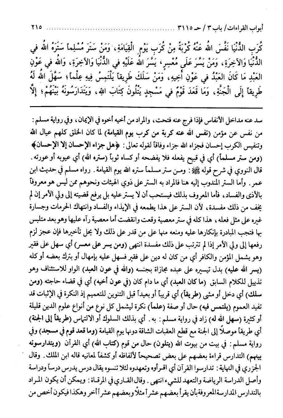 سُدَّ عَنْهُ مَدَاخِلُ الْأَنْفَاسِ فَإِذَا فُرِّجَ عَنْهُ فُتِحَتْ وَالْمُرَادُ مِنْ أَخِيهِ أَخُوهُ فِي الْإِيمَانِ وَفِي رِوَايَةِ مُسْلِمٍ مَنْ نَفَّسَ عَنْ مُؤْمِنٍ (نَفَّسَ اللَّهُ عَنْهُ كُرْبَةً مِنْ كُرَبِ يَوْمِ الْقِيَامَةِ) لَمَّا كَانَ الْخَلْقُ كُلُّهُمْ عِيَالَ اللَّهِ وَتَنْفِيسُ الْكُرَبِ إِحْسَانٌ فَجَزَاهُ اللَّهُ جَزَاءً وِفَاقًا لِقَوْلِهِ تَعَالَى {هَلْ جَزَاءُ الْإِحْسَانِ إِلَّا الْإِحْسَانُ} (وَمَنْ سَتَرَ مُسْلِمًا) أَيْ فِي قَبِيحٍ يَفْعَلُهُ فَلَا يَفْضَحُهُ أَوْ كَسَاهُ ثَوْبًا (سَتَرَهُ اللَّهُ) أَيْ عُيُوبَهُ أَوْ عَوْرَتَهُ قَالَ النَّوَوِيُّ فِي شَرْحِ قَوْلِهِ صَلَّى اللَّهُ عَلَيْهِ وَسَلَّمَ وَمَنْ سَتَرَ مُسْلِمًا سَتَرَهُ اللَّهُ يَوْمَ الْقِيَامَةِ رَوَاهُ مسلم في حديث بن عمر وأما الستر المندوب إليه هنا فَالْمُرَادُ بِهِ السَّتْرُ عَلَى ذَوِي الْهَيْئَاتِ وَنَحْوِهِمْ مِمَّنْ لَيْسَ هُوَ مَعْرُوفًا بِالْأَذَى وَالْفَسَادِ فَأَمَّا الْمَعْرُوفُ بِذَلِكَ فَيُسْتَحَبُّ أَنْ لَا يَسْتُرَ عَلَيْهِ بَلْ يَرْفَعُ قَضِيَّتَهُ إِلَى وَلِيِّ الْأَمْرِ إِنْ لَمْ يَخَفْ مِنْ ذَلِكَ مَفْسَدَةً لِأَنَّ السَّتْرَ عَلَى هَذَا يُطْمِعُهُ فِي الْإِيذَاءِ وَالْفَسَادِ وَانْتِهَاكِ الْحُرُمَاتِ وَجَسَارَةِ غَيْرِهِ عَلَى مِثْلِ فِعْلِهِ هَذَا كُلُّهُ فِي سَتْرِ مَعْصِيَةٍ وَقَعَتْ وَانْقَضَتْ أَمَّا مَعْصِيَةٌ رَآهُ عَلَيْهَا وَهُوَ بَعْدُ مُتَلَبِّسٌ بِهَا فَتَجِبُ الْمُبَادَرَةُ بِإِنْكَارِهَا عَلَيْهِ وَمَنْعُهُ مِنْهَا عَلَى مَنْ قَدَرَ عَلَى ذَلِكَ وَلَا يَحِلُّ تَأْخِيرُهَا فَإِنْ عَجَزَ لَزِمَ رَفْعُهَا إِلَى وَلِيِّ الْأَمْرِ إِذَا لَمْ تَتَرَتَّبْ عَلَى ذَلِكَ مَفْسَدَةٌ انْتَهَى (وَمَنْ يَسَّرَ عَلَى مُعْسِرٍ) أَيْ سَهَّلَ عَلَى فَقِيرٍ وَهُوَ يَشْمَلُ الْمُؤْمِنَ وَالْكَافِرَ أَيْ مَنْ كَانَ لَهُ دَيْنٌ عَلَى فَقِيرٍ فَسَهَّلَ عَلَيْهِ بِإِمْهَالٍ أَوْ بِتَرْكِ بَعْضِهِ أَوْ كُلِّهِ (يَسَّرَ اللَّهُ عَلَيْهِ) بَدَلَ تَيْسِيرِهِ عَلَى عَبْدِهِ مُجَازَاةً بِجِنْسِهِ (واللَّهُ فِي عَوْنِ الْعَبْدِ) الْوَاوُ لِلِاسْتِئْنَافِ وَهُوَ تَذْيِيلٌ لِلْكَلَامِ السَّابِقِ (مَا كَانَ الْعَبْدُ) أَيْ مَا دَامَ كَانَ (فِي عَوْنِ أَخِيهِ) أَيْ فِي قَضَاءِ حَاجَتِهِ (وَمَنْ سَلَكَ) أَيْ دَخَلَ أَوْ مَشَى (طَرِيقًا) أَيْ قَرِيبًا أَوْ بَعِيدًا قِيلَ التَّنْوِينُ لِلتَّعْمِيمِ إِذِ النَّكِرَةُ فِي الْإِثْبَاتِ قَدْ تُفِيدُ الْعُمُومَ (يَلْتَمِسُ فِيهِ) حَالٌ أو صفة (علما) نكره ليشمل كل نوع مِنْ أَنْوَاعِ عُلُومِ الدِّينِ قَلِيلَةً أَوْ كَثِيرَةً (سَهَّلَ اللَّهُ لَهُ) زَادَ فِي رِوَايَةِ مُسْلِمٍ بِهِ أَيْ بِذَلِكَ السُّلُوكِ أَوِ الِالْتِمَاسِ (طَرِيقًا إِلَى الْجَنَّةِ) أَيْ طَرِيقًا مُوَصِّلًا إِلَى الْجَنَّةِ مَعَ قَطْعِ الْعَقَبَاتِ الشَّاقَّةِ دُونَهَا يَوْمَ الْقِيَامَةِ (وَمَا قَعَدَ قَوْمٌ فِي مَسْجِدٍ) وَفِي رِوَايَةِ مُسْلِمٍ فِي بَيْتٍ مِنْ بُيُوتِ اللَّهِ (يَتْلُونَ) حَالٌ مِنْ قَوْمٌ (كِتَابَ اللَّهِ) أَيِ الْقُرْآنَ (وَيَتَدَارَسُونَهُ بَيْنَهُمْ) التَّدَارُسُ قِرَاءَةُ بَعْضِهِمْ عَلَى بَعْضٍ تصحيحا لألفاظه أو كشفا لمعانيه قاله بن الْمَلَكِ وَقَالَ الْجَزَرِيُّ فِي النِّهَايَةِ تَدَارَسُوا الْقُرْآنَ أي اقرؤوه وتعهدوه لئلا تنسوه يقال درس يدرس ودراسة وَأَصْلُ الدِّرَاسَةِ الرِّيَاضَةُ وَالتَّعَهُّدُ لِلشَّيْءِ انْتَهَى وَقَالَ القارىء فِي الْمِرْقَاةِ وَيُمْكِنُ أَنْ يَكُونَ الْمُرَادُ بِالتَّدَارُسِ الْمُدَارَسَةَ الْمَعْرُوفَةَ بِأَنْ يَقْرَأَ بَعْضُهُمْ عَشْرًا مَثَلًا وَبَعْضُهُمْ عَشْرًا آخَرَ وَهَكَذَا فَيَكُونَ أَخَصَّ مِنْ
