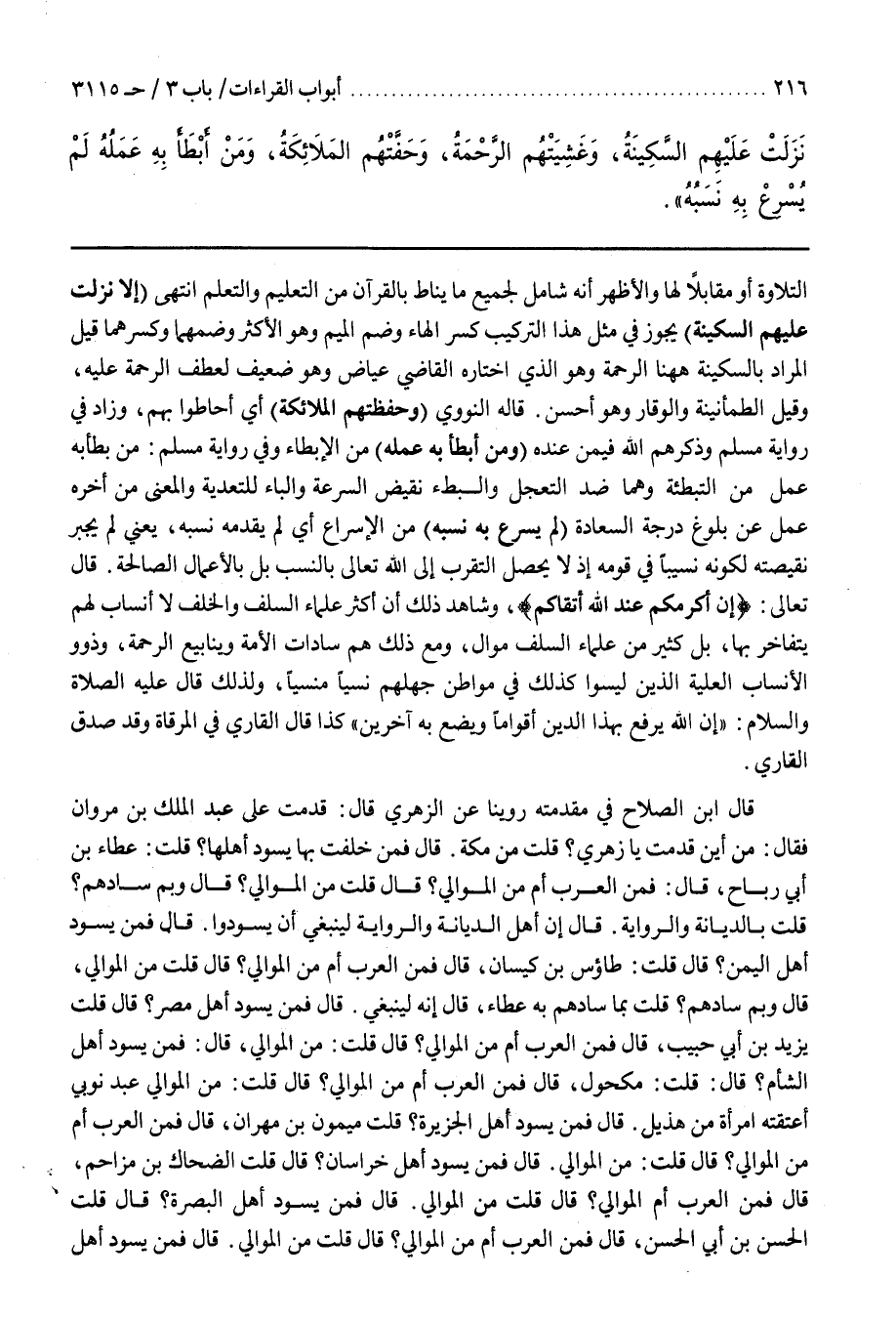 التِّلَاوَةِ أَوْ مُقَابِلًا لَهَا وَالْأَظْهَرُ أَنَّهُ شَامِلٌ لِجَمِيعِ مَا يُنَاطُ بِالْقُرْآنِ مِنَ التَّعْلِيمِ وَالتَّعَلُّمِ انْتَهَى (إِلَّا نَزَلَتْ عَلَيْهِمِ السَّكِينَةُ) يَجُوزُ فِي مِثْلِ هَذَا التَّرْكِيبِ كَسْرُ الْهَاءِ وَضَمُّ الْمِيمِ وَهُوَ الْأَكْثَرُ وَضَمُّهُمَا وَكَسْرُهُمَا قِيلَ الْمُرَادُ بِالسَّكِينَةِ ها هنا الرَّحْمَةُ وَهُوَ الَّذِي اخْتَارَهُ الْقَاضِي عِيَاضٌ وَهُوَ ضَعِيفٌ لِعَطْفِ الرَّحْمَةِ عَلَيْهِ وَقِيلَ الطُّمَأْنِينَةُ وَالْوَقَارُ وهو أحسن قاله النووي (وحفظتهم الْمَلَائِكَةُ) أَيْ أَحَاطُوا بِهِمْ وَزَادَ فِي رِوَايَةِ مُسْلِمٍ وَذَكَرَهُمِ اللَّهُ فِيمَنْ عِنْدَهُ (وَمَنْ أَبْطَأَ بِهِ عَمَلُهُ) مِنَ الْإِبْطَاءِ وَفِي رِوَايَةِ مُسْلِمٍ من بطأ به عمل من التبطئة وهما ضد التعجل والبطوء نَقِيضُ السُّرْعَةِ وَالْبَاءُ لِلتَّعْدِيَةِ وَالْمَعْنَى مَنْ أَخَّرَهُ عمل عَنْ بُلُوغِ دَرَجَةِ السَّعَادَةِ (لَمْ يُسْرِعْ بِهِ نَسَبُهُ) مِنَ الْإِسْرَاعِ أَيْ لَمْ يُقَدِّمْهُ نَسَبُهُ يَعْنِي لَمْ يَجْبُرْ نَقِيصَتَهُ لِكَوْنِهِ نَسِيبًا فِي قَوْمِهِ إِذْ لَا يَحْصُلُ التَّقَرُّبُ إِلَى اللَّهِ تَعَالَى بِالنَّسَبِ بَلْ بِالْأَعْمَالِ الصَّالِحَةِ قَالَ تَعَالَى {إن أكرمكم عند الله أتقاكم} وَشَاهِدُ ذَلِكَ أَنَّ أَكْثَرَ عُلَمَاءِ السَّلَفِ وَالْخَلَفِ لَا أَنْسَابَ لَهُمْ يُتَفَاخَرُ بِهَا بَلْ كَثِيرٌ مِنْ عُلَمَاءِ السَّلَفِ مَوَالٍ وَمَعَ ذَلِكَ هُمْ سَادَاتُ الْأُمَّةِ وَيَنَابِيعُ الرَّحْمَةِ وَذَوُو الْأَنْسَابِ الْعَلِيَّةِ الَّذِينَ لَيْسُوا كَذَلِكَ فِي مَوَاطِنِ جَهْلِهِمْ نَسْيًا مَنْسِيًّا وَلِذَلِكَ قَالَ عَلَيْهِ الصَّلَاةُ وَالسَّلَامُ إِنَّ اللَّهَ يَرْفَعُ بِهَذَا الدِّينِ أَقْوَامًا وَيَضَعُ بِهِ آخرين كذا قال القارىء في المرقاة وقد صدق القارىء قال بن الصَّلَاحِ فِي مُقَدِّمَتِهِ رَوَيْنَا عَنْ الزُّهْرِيِّ قَالَ قَدِمْتُ عَلَى عَبْدِ الْمَلِكِ بْنِ مَرْوَانَ فَقَالَ مِنْ أَيْنَ قَدِمْتَ يَا زُهْرِيٌّ قُلْتُ مِنْ مَكَّةَ قَالَ فَمَنْ خَلّفْتَ بِهَا يَسُودُ أَهْلَهَا قُلْتُ عَطَاءُ بْنُ أَبِي رَبَاحٍ قَالَ فَمِنْ الْعَرَبِ أَمْ مِنْ الْمَوَالِي قَالَ قُلْتُ مِنْ الْمَوَالِي قُلْتُ مِنْ الْمَوَالِي قَالَ وَبِمَ سَادَهُمْ قُلْتُ بِالدِّيَانَةِ وَالرِّوَايَةِ قَالَ إِنَّ أَهْلَ الدِّيَانَةِ وَالرِّوَايَةِ لَيَنْبَغِي أَنْ يَسُودُوا قَالَ فَمَنْ يَسُودُ أَهْلَ الْيَمَنِ قَالَ قُلْتُ طَاوُسُ بْنُ كَيْسَانَ قَالَ فَمِنْ الْعَرَبِ أَمْ مِنْ الْمَوَالِي قَالَ قُلْتُ مِنْ الْمَوَالِي قَالَ وَبِمَ سَادَهُمْ قُلْتُ بِمَا سَادَهُمْ بِهِ عَطَاءٌ قَالَ إِنَّهُ لَيَنْبَغِي قَالَ فَمَنْ يَسُودُ أَهْلَ مِصْرَ قَالَ قُلْتُ يَزِيدُ بْنُ أَبِي حَبِيبٍ قَالَ فَمِنْ الْعَرَبِ أَمْ مِنْ الْمَوَالِي قَالَ قُلْتُ مِنْ الْمَوَالِي قَالَ فَمَنْ يَسُودُ أَهْلَ الشَّامِ قَالَ قُلْتُ مَكْحُولٌ قَالَ فَمِنْ الْعَرَبِ أَمْ مِنْ الْمَوَالِي قَالَ قُلْتُ مِنْ الْمَوَالِي عَبْدٌ نُوبِيٌّ أَعْتَقَتْهُ اِمْرَأَةٌ مِنْ هُذَيْلٍ قَالَ فَمَنْ يَسُودُ أَهْلَ الْجَزِيرَةِ قُلْتُ مَيْمُونُ بْنُ مِهْرَانَ قَالَ فَمِنْ الْعَرَبِ أَمْ مِنْ الْمَوَالِي قَالَ قُلْتُ مِنْ الْمَوَالِي قَالَ فَمَنْ يَسُودُ أَهْلَ خُرَاسَانَ قَالَ قُلْتُ الضَّحَّاكُ بْنُ مُزَاحِمٍ قَالَ فَمِنَ الْعَرَبِ أَمِ الْمَوَالِي قَالَ قُلْتُ مِنْ الْمَوَالِي قَالَ فَمَنْ يَسُودُ أَهْلَ الْبَصْرَةِ قَالَ قُلْتُ الْحَسَنُ بْنُ أَبِي الْحَسَنِ قَالَ فَمِنْ الْعَرَبِ أَمْ مِنْ الْمَوَالِي قَالَ قُلْتُ مِنْ الْمَوَالِي قَالَ فَمَنْ يَسُودُ أَهْلَ