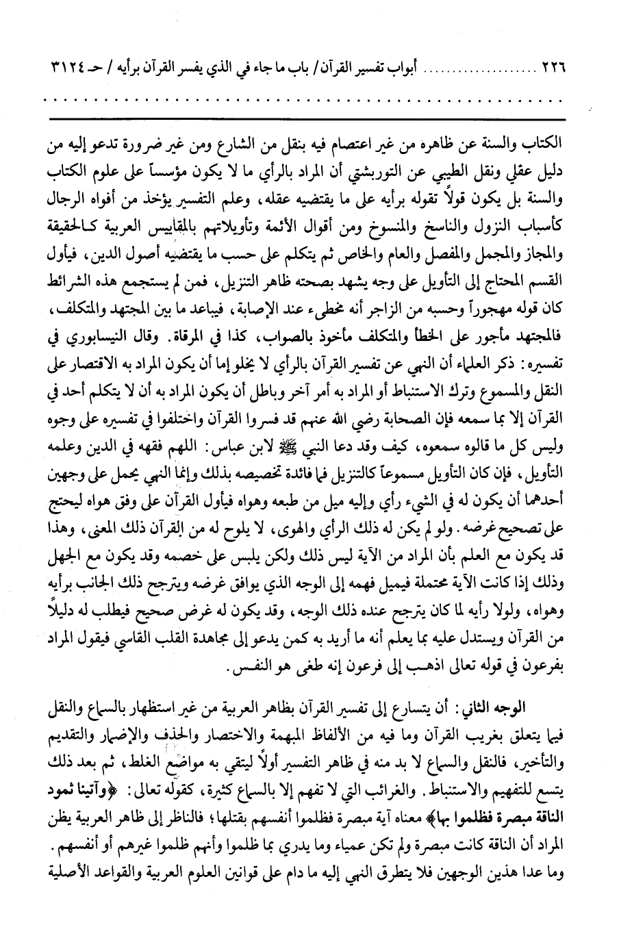 وَقَالَ النَّيْسَابُورِيُّ فِي تَفْسِيرِهِ ذَكَرَ الْعُلَمَاءُ أَنَّ النَّهْيَ عَنْ تَفْسِيرِ الْقُرْآنِ بِالرَّأْيِ لَا يَخْلُو إِمَّا أَنْ يَكُونَ الْمُرَادُ بِهِ الِاقْتِصَارُ عَلَى النَّقْلِ وَالْمَسْمُوعِ وَتَرْكُ الِاسْتِنْبَاطِ أَوِ الْمُرَادُ بِهِ أَمْرٌ آخَرُ وَبَاطِلٌ أَنْ يَكُونَ الْمُرَادُ بِهِ أَنْ لَا يَتَكَلَّمَ أَحَدٌ فِي الْقُرْآنِ إِلَّا بِمَا سَمِعَهُ فَإِنَّ الصَّحَابَةَ رَضِيَ اللَّهُ عَنْهُمْ قَدْ فَسَّرُوا الْقُرْآنَ وَاخْتَلَفُوا فِي تَفْسِيرِهِ عَلَى وُجُوهٍ وَلَيْسَ كُلُّ مَا قَالُوهُ سَمِعُوهُ كَيْفَ وَقَدْ دَعَا النَّبِيُّ صَلَّى اللَّهُ عَلَيْهِ وَسَلَّمَ لِابْنِ عَبَّاسٍ اللَّهُمَّ فَقِّهْهُ فِي الدِّينِ وَعَلِّمْهُ التَّأْوِيلَ فَإِنْ كَانَ التَّأْوِيلُ مَسْمُوعًا كَالتَّنْزِيلِ فَمَا فَائِدَةُ تَخْصِيصِهِ بِذَلِكَ وَإِنَّمَا النَّهْيُ يُحْمَلُ عَلَى وَجْهَيْنِ أَحَدُهُمَا أَنْ يَكُونَ لَهُ فِي الشَّيْءِ رأي وإليه ميل من طبعه وهواه فيأول الْقُرْآنَ عَلَى وِفْقِ هَوَاهُ لِيَحْتَجَّ عَلَى تَصْحِيحِ غَرَضِهِ وَلَوْ لَمْ يَكُنْ لَهُ ذَلِكَ الرَّأْيُ وَالْهَوَى لَا يَلُوحُ لَهُ مِنَ الْقُرْآنِ ذَلِكَ الْمَعْنَى وَهَذَا قَدْ يَكُونُ مَعَ الْعِلْمِ بِأَنَّ الْمُرَادَ مِنَ الْآيَةِ لَيْسَ ذَلِكَ وَلَكِنْ يُلَبِّسُ عَلَى خَصْمِهِ وَقَدْ يَكُونُ مَعَ الْجَهْلِ وَذَلِكَ إِذَا كَانَتِ الْآيَةُ مُحْتَمِلَةً فَيَمِيلُ فَهْمُهُ إِلَى الْوَجْهِ الَّذِي يُوَافِقُ غَرَضَهُ وَيَتَرَجَّحُ ذَلِكَ الْجَانِبُ بِرَأْيِهِ وَهَوَاهُ وَلَوْلَا رَأْيُهُ لَمَا كَانَ يَتَرَجَّحُ عِنْدَهُ ذَلِكَ الْوَجْهُ وَقَدْ يَكُونُ لَهُ غَرَضٌ صَحِيحٌ فَيَطْلُبُ لَهُ دَلِيلًا مِنَ الْقُرْآنِ وَيَسْتَدِلُّ عَلَيْهِ بِمَا يَعْلَمُ أَنَّهُ مَا أُرِيدَ بِهِ كَمَنْ يَدْعُو إِلَى مُجَاهِدَةِ الْقَلْبِ الْقَاسِي فَيَقُولُ الْمُرَادُ بِفِرْعَوْنَ فِي قَوْلِهِ تَعَالَى اذْهَبْ إِلَى فرعون إنه طغى هُوَ النَّفْسُ