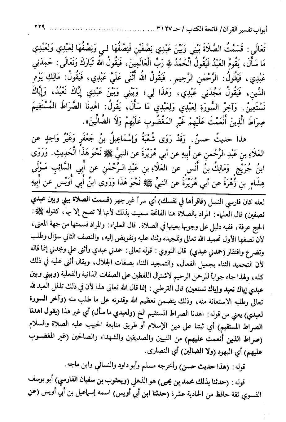 لَعَلَّهُ كَانَ فَارِسِيَّ النَّسْلِ (فَاقْرَأْهَا فِي نَفْسِكَ) أَيْ سِرًّا غَيْرَ جَهْرٍ (قَسَمْتُ الصَّلَاةَ بَيْنِي وَبَيْنَ عَبْدِي نِصْفَيْنِ) قَالَ الْعُلَمَاءُ الْمُرَادُ بِالصَّلَاةِ هُنَا الْفَاتِحَةُ سُمِّيَتْ بِذَلِكَ لِأَنَّهَا لَا تَصِحُّ إِلَّا بِهَا كَقَوْلِهِ صَلَّى اللَّهُ عَلَيْهِ وَسَلَّمَ الْحَجُّ عَرَفَةُ فَفِيهِ دَلِيلٌ عَلَى وُجُوبِهَا بِعَيْنِهَا فِي الصَّلَاةِ
