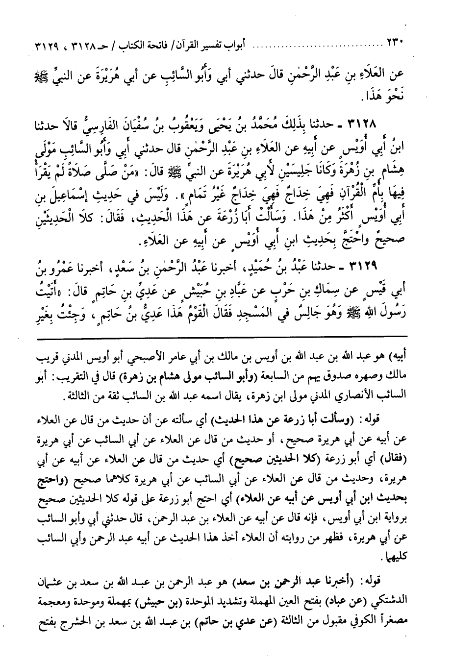 قَوْلُهُ (وَسَأَلْتُ أَبَا زُرْعَةَ عَنْ هَذَا الْحَدِيثِ) أَيْ سَأَلْتُهُ عَنْ أَنَّ حديث من قال عَنِ الْعَلَاءِ عَنْ أَبِيهِ عَنْ أَبِي هُرَيْرَةَ صَحِيحٌ أَوْ حَدِيثَ مَنْ قَالَ عَنِ الْعَلَاءِ عَنْ أَبِي السَّائِبِ عَنْ أَبِي هُرَيْرَةَ (فَقَالَ) أَيْ أَبُو زُرْعَةَ (كِلَا الْحَدِيثِينَ صَحِيحٌ) أَيْ حَدِيثُ مَنْ قَالَ عَنِ الْعَلَاءِ عَنْ أَبِيهِ عَنْ أَبِي هُرَيْرَةَ وَحَدِيثُ مَنْ قَالَ عَنِ الْعَلَاءِ عَنْ أَبِي السَّائِبِ عَنْ أَبِي هُرَيْرَةَ كِلَاهُمَا صَحِيحٌ (وَاحْتَجَّ بِحَدِيثِ بن أَبِي أُوَيْسٍ عَنْ أَبِيهِ عَنِ الْعَلَاءِ) أَيِ احْتَجَّ أَبُو زُرْعَةَ عَلَى قَوْلِهِ كِلَا الْحَدِيثَيْنِ صحيح برواية بن أَبِي أُوَيْسٍ فَإِنَّهُ قَالَ عَنْ أَبِيهِ عَنِ الْعَلَاءِ بْنِ عَبْدِ الرَّحْمَنِ قَالَ حَدَّثَنِي أَبِي وَأَبُو السَّائِبِ عَنْ أَبِي هُرَيْرَةَ فَظَهَرَ مِنْ رِوَايَتِهِ أَنَّ الْعَلَاءَ أَخَذَ هَذَا الْحَدِيثَ عَنْ أَبِيهِ عَبْدِ الرَّحْمَنِ وَأَبِي السَّائِبِ كِلَيْهِمَا