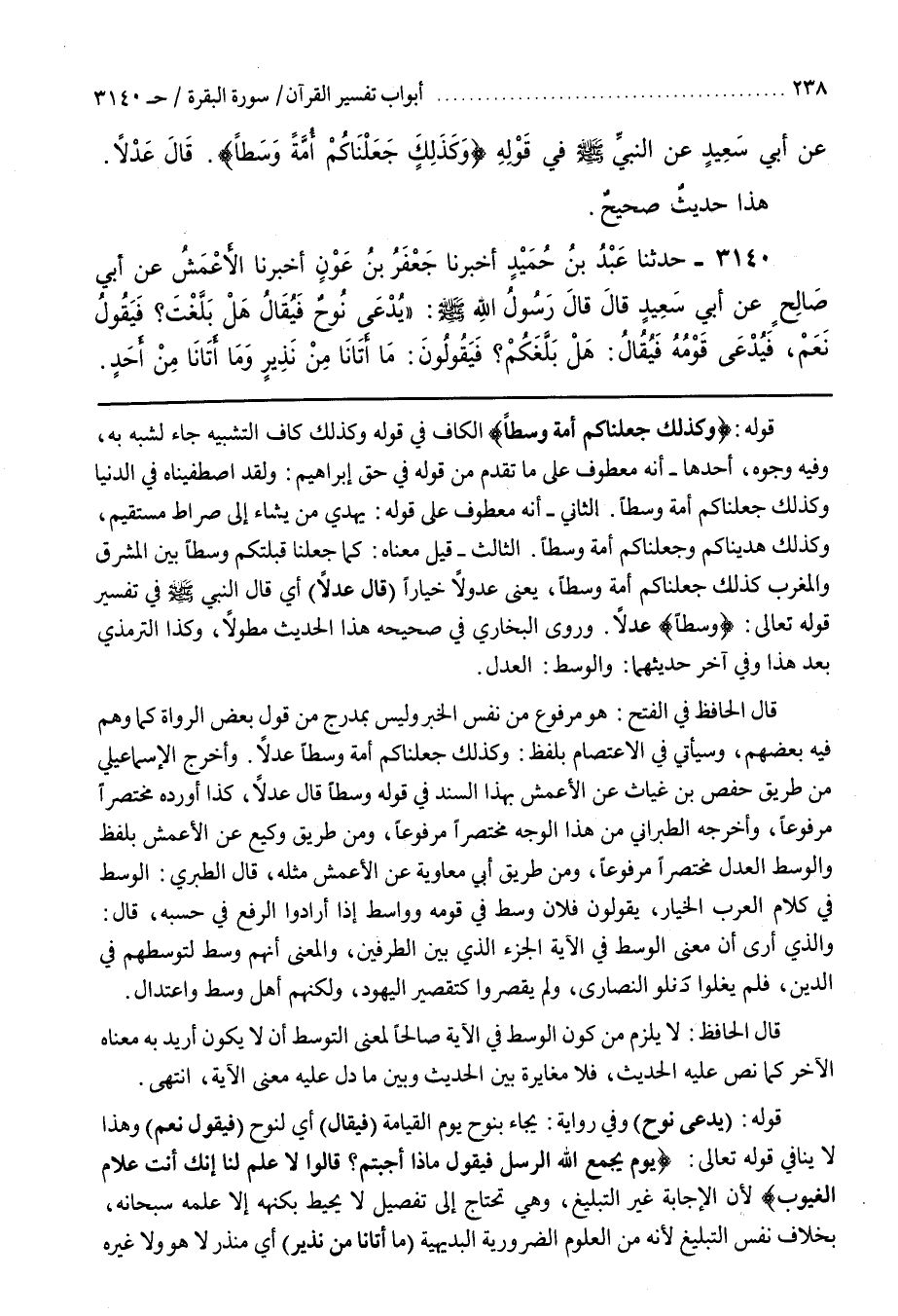 وَأَخْرَجَ الْإِسْمَاعِيلِيُّ مِنْ طَرِيقِ حَفْصِ بْنِ غِيَاثٍ عَنِ الْأَعْمَشِ بِهَذَا السَّنَدِ فِي قَوْلِهِ وَسَطًا قَالَ عَدْلًا كَذَا أَوْرَدَهُ مُخْتَصَرًا مَرْفُوعًا وَأَخْرَجَهُ الطَّبَرَانِيُّ مِنْ هَذَا الْوَجْهِ مُخْتَصَرًا مَرْفُوعًا وَمِنْ طَرِيقِ وَكِيعٍ عَنِ الْأَعْمَشِ بِلَفْظِ وَالْوَسَطُ الْعَدْلُ مُخْتَصَرًا مَرْفُوعًا وَمِنْ طَرِيقِ أَبِي مُعَاوِيَةَ عَنِ الْأَعْمَشِ مِثْلَهُ قَالَ الطَّبَرِيُّ الْوَسَطُ فِي كَلَامِ الْعَرَبِ الْخِيَارُ يَقُولُونَ فُلَانٌ وَسَطٌ فِي قَوْمِهِ وَوَاسِطٌ إِذَا أَرَادُوا الرَّفْعَ فِي حَسَبِهِ قَالَ وَالَّذِي أَرَى أَنَّ مَعْنَى الْوَسَطِ فِي الْآيَةِ الْجُزْءُ الَّذِي بَيْنَ الطَّرَفَيْنِ وَالْمَعْنَى أَنَّهُمْ وَسَطٌ لِتَوَسُّطِهِمْ فِي الدِّينِ فَلَمْ يَغْلُوا كَغُلُوِّ النَّصَارَى وَلَمْ يُقَصِّرُوا كَتَقْصِيرِ الْيَهُودِ وَلَكِنَّهُمْ أَهْلُ وَسَطٍ وَاعْتِدَالٍ