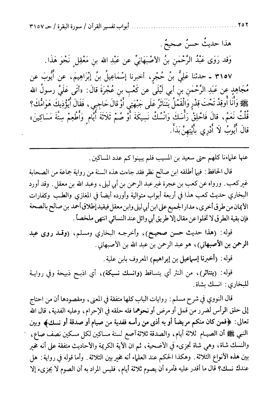 قَالَ النَّوَوِيُّ فِي شَرْحِ مُسْلِمٍ رِوَايَاتُ الْبَابِ كُلُّهَا مُتَّفِقَةٌ فِي الْمَعْنَى وَمَقْصُودُهَا أَنَّ مَنِ احْتَاجَ إِلَى حَلْقِ الرَّأْسِ لِضَرَرٍ مِنْ قَمْلٍ أَوْ مَرَضٍ أَوْ نَحْوِهِمَا فَلَهُ حَلْقُهُ فِي الْإِحْرَامِ وَعَلَيْهِ الْفِدْيَةُ قَالَ اللَّهُ تَعَالَى فَمَنْ كَانَ مِنْكُمْ مَرِيضًا أَوْ بِهِ أَذًى مِنْ رَأْسِهِ فَفِدْيَةٌ من صيام أو صدقة أو نسك وبين النبي أَنَّ الصِّيَامَ ثَلَاثَةُ أَيَّامٍ وَالصَّدَقَةُ ثَلَاثَةُ آصُعٍ لِسِتَّةِ مَسَاكِينَ لِكُلِّ مِسْكِينٍ نِصْفُ صَاعٍ وَالنُّسُكُ شاة وهي شاة تجزىء فِي الْأُضْحِيَّةِ ثُمَّ إِنَّ الْآيَةَ الْكَرِيمَةَ وَالْأَحَادِيثَ مُتَّفِقَةٌ عَلَى أَنَّهُ مُخَيَّرٌ بَيْنَ هَذِهِ الْأَنْوَاعِ الثَّلَاثَةِ