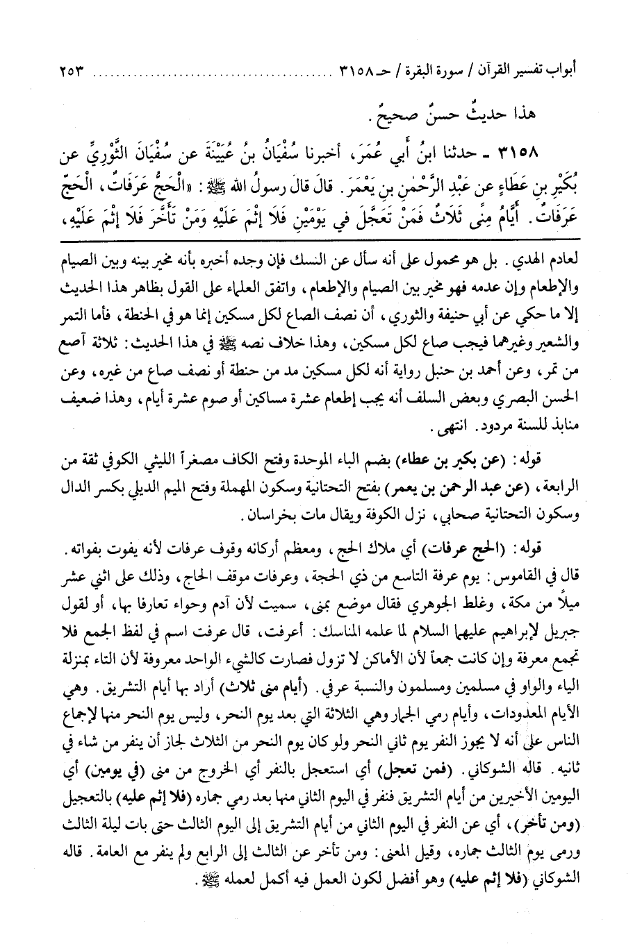 قَوْلُهُ (عَنْ بُكَيْرِ بْنِ عَطَاءٍ) بِضَمِّ الْبَاءِ الْمُوَحَّدَةِ وَفَتْحِ الْكَافِ مُصَغَّرًا اللَّيْثِيِّ الْكُوفِيِّ ثِقَةٌ مِنَ الرَّابِعَةِ (عَنْ عَبْدِ الرَّحْمَنِ بْنِ يَعْمَرَ) بِفَتْحِ التَّحْتَانِيَّةِ وَسُكُونِ الْمُهْمَلَةِ وَفَتْحِ الْمِيمِ الديلي بِكَسْرِ الدَّالِ وَسُكُونِ التَّحْتَانِيَّةِ صَحَابِيٌّ