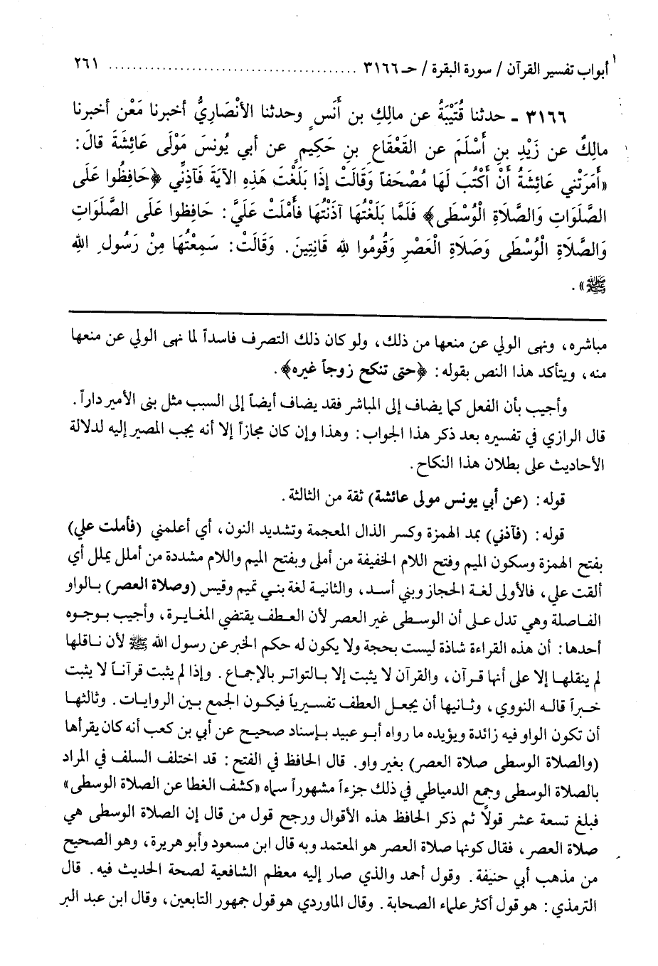 وَثَالِثُهَا أَنْ تَكُونَ الْوَاوُ فِيهِ زَائِدَةً وَيُؤَيِّدُهُ مَا رَوَاهُ أَبُو عُبَيْدٍ بِإِسْنَادٍ صَحِيحٍ عَنْ أُبَيِّ بْنِ كَعْبٍ أَنَّهُ كَانَ يَقْرَأُهَا (وَالصَّلَاةِ الْوُسْطَى صَلَاةِ الْعَصْرِ) بِغَيْرِ وَاوٍ قَالَ الْحَافِظُ فِي الْفَتْحِ قَدِ اخْتَلَفَ السَّلَفُ فِي الْمُرَادِ بِالصَّلَاةِ الْوُسْطَى وَجَمَعَ الدِّمْيَاطِيُّ فِي ذَلِكَ جُزْءًا مَشْهُورًا سَمَّاهُ كَشْفُ الْغَطَا عَنِ الصَّلَاةِ الْوُسْطَى فَبَلَغَ تِسْعَةَ عَشْرَ قَوْلًا ثُمَّ ذَكَرَ الْحَافِظُ هَذِهِ الْأَقْوَالَ وَرَجَّحَ قَوْلَ مَنْ قَالَ إِنَّ الصَّلَاةَ الْوُسْطَى هِيَ صَلَاةُ الْعَصْرِ فَقَالَ كَوْنُهَا صَلَاةَ الْعَصْرِ هُوَ المعتمد وبه قال بن مَسْعُودٍ وَأَبُو هُرَيْرَةَ وَهُوَ الصَّحِيحُ مِنْ مَذْهَبِ أَبِي حَنِيفَةَ وَقَوْلِ أَحْمَدَ وَالَّذِي صَارَ إِلَيْهِ مُعْظَمُ الشَّافِعِيَّةِ لِصِحَّةِ الْحَدِيثِ فِيهِ قَالَ التِّرْمِذِيُّ هُوَ قَوْلُ أَكْثَرِ عُلَمَاءِ الصَّحَابَةِ وَقَالَ الْمَاوَرْدِيُّ هو قول جمهور التابعين وقال بن عَبْدِ الْبَرِّ هُوَ قَوْلُ أَكْثَرِ
