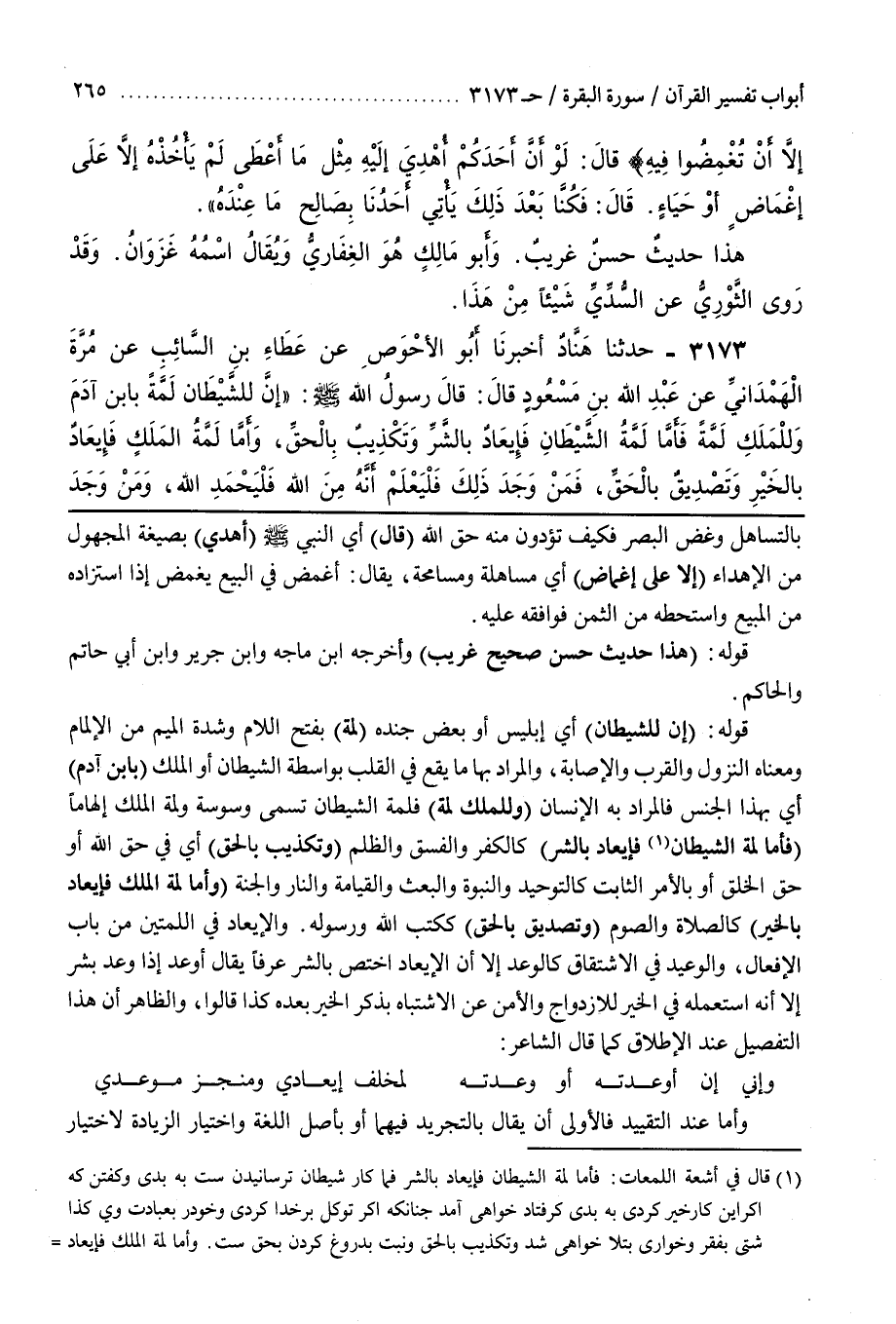 وَأَمَّا عِنْدَ التَّقْيِيدِ فَالْأَوْلَى أَنْ يُقَالَ بِالتَّجْرِيدِ فِيهِمَا أَوْ بِأَصْلِ اللُّغَةِ وَاخْتِيَارِ الزِّيَادَةِ لِاخْتِيَارِ الْمُبَالَغَةِ فَمَنْ وَجَدَ أَيْ فِي نَفْسِهِ أَوْ أَدْرَكَ وَعَرَفَ (ذَلِكَ) أَيْ لَمَّةَ الْمَلَكِ عَلَى تَأْوِيلِ الْإِلْمَامِ أَوِ الْمَذْكُورِ (فَلْيَعْلَمْ أَنَّهُ مِنَ اللَّهِ) أَيْ مِنَّةٌ جَسِيمَةٌ وَنِعْمَةٌ عَظِيمَةٌ وَاصِلَةٌ إِلَيْهِ وَنَازِلَةٌ عَلَيْهِ إِذْ أَمَرَ الْمَلَكَ بِأَنْ يُلْهِمَهُ (فَلْيَحْمَدِ اللَّهَ) أَيْ عَلَى هَذِهِ النِّعْمَةِ الْجَلِيلَةِ حَيْثُ أَهَلَّهُ لِهِدَايَةِ الْمَلَكِ وَدَلَالَتِهِ عَلَى ذَلِكَ الْخَيْرِ (وَمَنْ وَجَدَ الْأُخْرَى) أَيْ لَمَّةَ الشيطان (ثم قرأ) أي النبي استشهادا الشيطان يعدكم الفقر