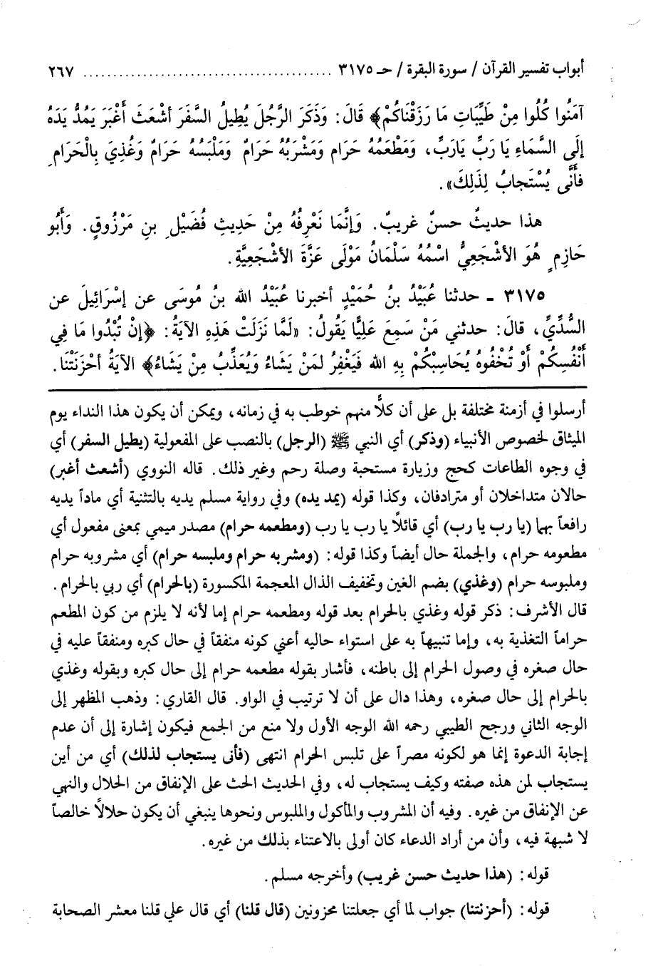 أُرْسِلُوا فِي أَزْمِنَةٍ مُخْتَلِفَةٍ بَلْ عَلَى أَنَّ كُلًّا مِنْهُمْ خُوطِبَ بِهِ فِي زَمَانِهِ وَيُمْكِنُ أَنْ يَكُونَ هَذَا النِّدَاءُ يَوْمَ الْمِيثَاقِ لِخُصُوصِ الأنبياء (وذكر) أي النبي (الرَّجُلَ) بِالنَّصْبِ عَلَى الْمَفْعُولِيَّةِ (يُطِيلُ السَّفَرَ) أَيْ فِي وُجُوهِ الطَّاعَاتِ كَحَجٍّ وَزِيَارَةٍ مُسْتَحَبَّةٍ وَصِلَةِ رَحِمٍ وَغَيْرِ ذَلِكَ قَالَهُ النَّوَوِيُّ أَشْعَثَ أَغْبَرَ حَالَانِ مُتَدَاخِلَانِ أَوْ مُتَرَادِفَانِ وَكَذَا قَوْلُهُ يَمُدُّ يَدَهُ وَفِي رِوَايَةِ مُسْلِمٍ يَدَيْهِ بِالتَّثْنِيَةِ أَيْ مَادًّا يَدَيْهِ رَافِعًا بِهِمَا يَا رَبِّ يَا رَبِّ أَيْ قَائِلًا يَا رَبِّ يَا رَبِّ وَمَطْعَمُهُ حَرَامٌ مَصْدَرٌ مِيمِيٌّ بِمَعْنَى مَفْعُولٍ أَيْ مَطْعُومُهُ حَرَامٌ وَالْجُمْلَةُ حَالٌ أَيْضًا وَكَذَا قَوْلُهُ وَمَشْرَبُهُ حَرَامٌ وَمَلْبَسُهُ حَرَامٌ أَيْ مَشْرُوبُهُ حَرَامٌ وَمَلْبُوسُهُ حَرَامٌ وَغُذِّيَ بِضَمِّ الْغَيْنِ وَتَخْفِيفِ الذَّالِ الْمُعْجَمَةِ الْمَكْسُورَةِ بِالْحَرَامِ أَيْ رُبِّيَ بِالْحَرَامِ