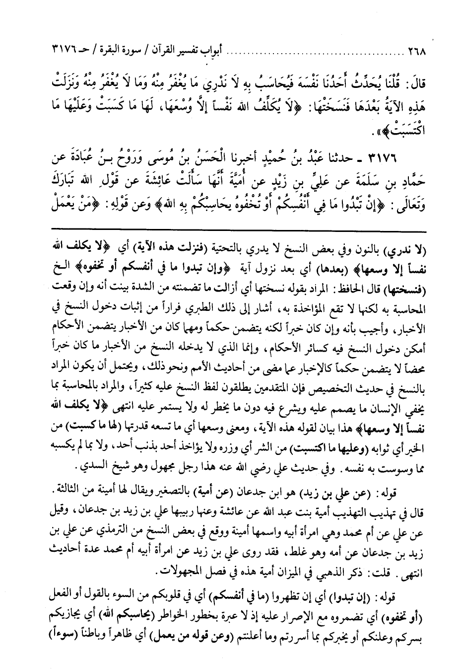 (لاندري) بِالنُّونِ وَفِي بَعْضِ النُّسَخِ لَا يَدْرِي بِالتَّحْتِيَّةِ (فَنَزَلَتْ هَذِهِ الْآيَةُ) أَيْ لَا يُكَلِّفُ اللَّهُ نفسا إلا وسعها (بَعْدَهَا) أَيْ بَعْدَ نُزُولِ آيَةِ وَإِنْ تُبْدُوا مَا فِي أَنْفُسِكُمْ أَوْ تُخْفُوهُ إِلَخْ (فَنَسَخَتْهَا) قَالَ الْحَافِظُ الْمُرَادُ بِقَوْلِهِ نَسَخَتْهَا أَيْ أَزَالَتْ ما تضمنته من الشدة بينت أَنَّهُ وَإِنْ وَقَعَتِ الْمُحَاسَبَةُ بِهِ لَكِنَّهَا لَا تَقَعُ الْمُؤَاخَذَةُ بِهِ أَشَارَ إِلَى ذَلِكَ الطَّبَرِيُّ فِرَارًا مِنْ إِثْبَاتِ دُخُولِ النَّسْخِ فِي الْأَخْبَارِ وَأُجِيبَ بِأَنَّهُ وَإِنْ كَانَ خَبَرًا لَكِنَّهُ يَتَضَمَّنُ حُكْمًا وَمَهْمَا كَانَ مِنَ الْأَخْبَارِ يَتَضَمَّنُ الْأَحْكَامَ أَمْكَنَ دُخُولُ النَّسْخِ فِيهِ كَسَائِرِ الْأَحْكَامِ وَإِنَّمَا الَّذِي لَا يَدْخُلُهُ النَّسْخُ مِنَ الْأَخْبَارِ مَا كَانَ خَبَرًا مَحْضًا لَا يَتَضَمَّنُ حُكْمًا كَالْإِخْبَارِ عَمَّا مَضَى مِنْ أَحَادِيثِ الْأُمَمِ وَنَحْوِ ذَلِكَ وَيَحْتَمِلُ أَنْ يَكُونَ الْمُرَادُ بِالنَّسْخِ فِي حَدِيثِ التَّخْصِيصِ فَإِنَّ الْمُتَقَدِّمِينَ يُطْلِقُونَ لَفْظَ النَّسْخِ عَلَيْهِ كَثِيرًا وَالْمُرَادُ بِالْمُحَاسَبَةِ بِمَا يُخْفِي الْإِنْسَانُ مَا يُصَمِّمُ عَلَيْهِ وَيَشْرَعُ فِيهِ دُونَ مَا يَخْطُرُ لَهُ وَلَا يَسْتَمِرُّ عَلَيْهِ انْتَهَى لَا يُكَلِّفُ الله نفسا إلا وسعها هَذَا بَيَانٌ لِقَوْلِهِ هَذِهِ الْآيَةَ وَمَعْنَى وُسْعَهَا أَيْ مَا تَسَعُهُ قُدْرَتُهَا لَهَا مَا كَسَبَتْ مِنَ الْخَيْرِ أَيْ ثَوَابُهُ وَعَلَيْهَا مَا اكْتَسَبَتْ مِنَ الشَّرِّ أَيْ وِزْرُهُ وَلَا يُؤَاخَذُ أَحَدٌ بِذَنْبِ أَحَدٍ