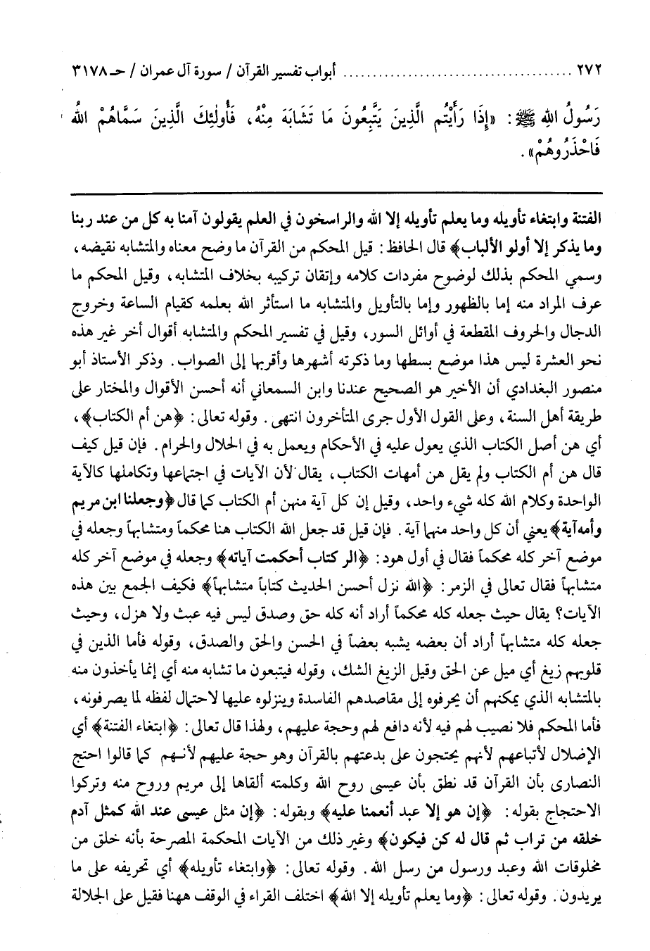 فَإِنْ قِيلَ قَدْ جَعَلَ اللَّهُ الْكِتَابَ هُنَا مُحْكَمًا وَمُتَشَابِهًا وَجَعَلَهُ فِي مَوْضِعٍ آخَرَ كُلَّهُ مُحْكَمًا فَقَالَ فِي أَوَّلِ هُودٍ الر كتاب أحكمت آياته وَجَعَلَهُ فِي مَوْضِعٍ آخَرَ كُلَّهُ مُتَشَابِهًا فَقَالَ تَعَالَى فِي الزُّمَرِ اللَّهُ نَزَّلَ أَحْسَنَ الْحَدِيثِ كتابا متشابها فَكَيْفَ الْجَمْعُ بَيْنَ هَذِهِ الْآيَاتِ يُقَالُ حَيْثُ جَعَلَهُ كُلَّهُ مُحْكَمًا أَرَادَ أَنَّهُ كُلَّهُ حَقٌّ وَصِدْقٌ لَيْسَ فِيهِ عَبَثٌ وَلَا هَزْلٌ وَحَيْثُ جَعَلَهُ كُلَّهُ مُتَشَابِهًا أَرَادَ أَنَّ بَعْضَهُ يُشْبِهُ بَعْضًا فِي الْحُسْنِ وَالْحَقِّ وَالصِّدْقِ وَقَوْلُهُ فَأَمَّا الذين في قلوبهم زيغ أَيْ مَيْلٌ عَنِ الْحَقِّ وَقِيلَ الزَّيْغُ الشَّكُّ وَقَوْلُهُ فَيَتَّبِعُونَ مَا تَشَابَهَ مِنْهُ أَيْ إِنَّمَا يَأْخُذُونَ مِنْهُ بِالْمُتَشَابِهِ الَّذِي يُمْكِنُهُمْ أَنْ يُحَرِّفُوهُ إِلَى مَقَاصِدِهِمُ الْفَاسِدَةِ وَيُنْزِلُوهُ عَلَيْهَا لِاحْتِمَالِ لَفْظِهِ لِمَا يَصْرِفُونَهُ فَأَمَّا الْمُحْكَمُ فَلَا نَصِيبَ لَهُمْ فِيهِ لِأَنَّهُ دَافِعٌ لَهُمْ وَحُجَّةٌ عَلَيْهِمْ وَلِهَذَا قَالَ تَعَالَى ابْتِغَاءَ الْفِتْنَةِ أَيِ الْإِضْلَالِ لِأَتْبَاعِهِمْ لِأَنَّهُمْ يَحْتَجُّونَ عَلَى بِدْعَتِهِمْ بِالْقُرْآنِ وَهُوَ حُجَّةٌ عَلَيْهِمْ لِأَنَّهُمْ كَمَا قَالُوا احْتَجَّ النَّصَارَى بِأَنَّ الْقُرْآنَ قَدْ نَطَقَ بِأَنَّ عِيسَى رُوحُ اللَّهِ وَكَلِمَتُهُ أَلْقَاهَا إِلَى مَرْيَمَ وَرُوحٌ مِنْهُ وَتَرَكُوا الِاحْتِجَاجَ بِقَوْلِهِ إِنْ هُوَ إِلَّا عَبْدٌ أَنْعَمْنَا عَلَيْهِ وَبِقَوْلِهِ إِنَّ مَثَلَ عِيسَى عِنْدَ اللَّهِ كَمَثَلِ آدَمَ خَلَقَهُ مِنْ تُرَابٍ ثُمَّ قَالَ له كن فيكون وَغَيْرِ ذَلِكَ مِنَ الْآيَاتِ الْمُحْكَمَةِ الْمُصَرِّحَةِ بِأَنَّهُ خَلْقٌ مِنْ مَخْلُوقَاتِ اللَّهِ وَعَبْدٌ وَرَسُولٌ مِنْ رُسُلِ اللَّهِ