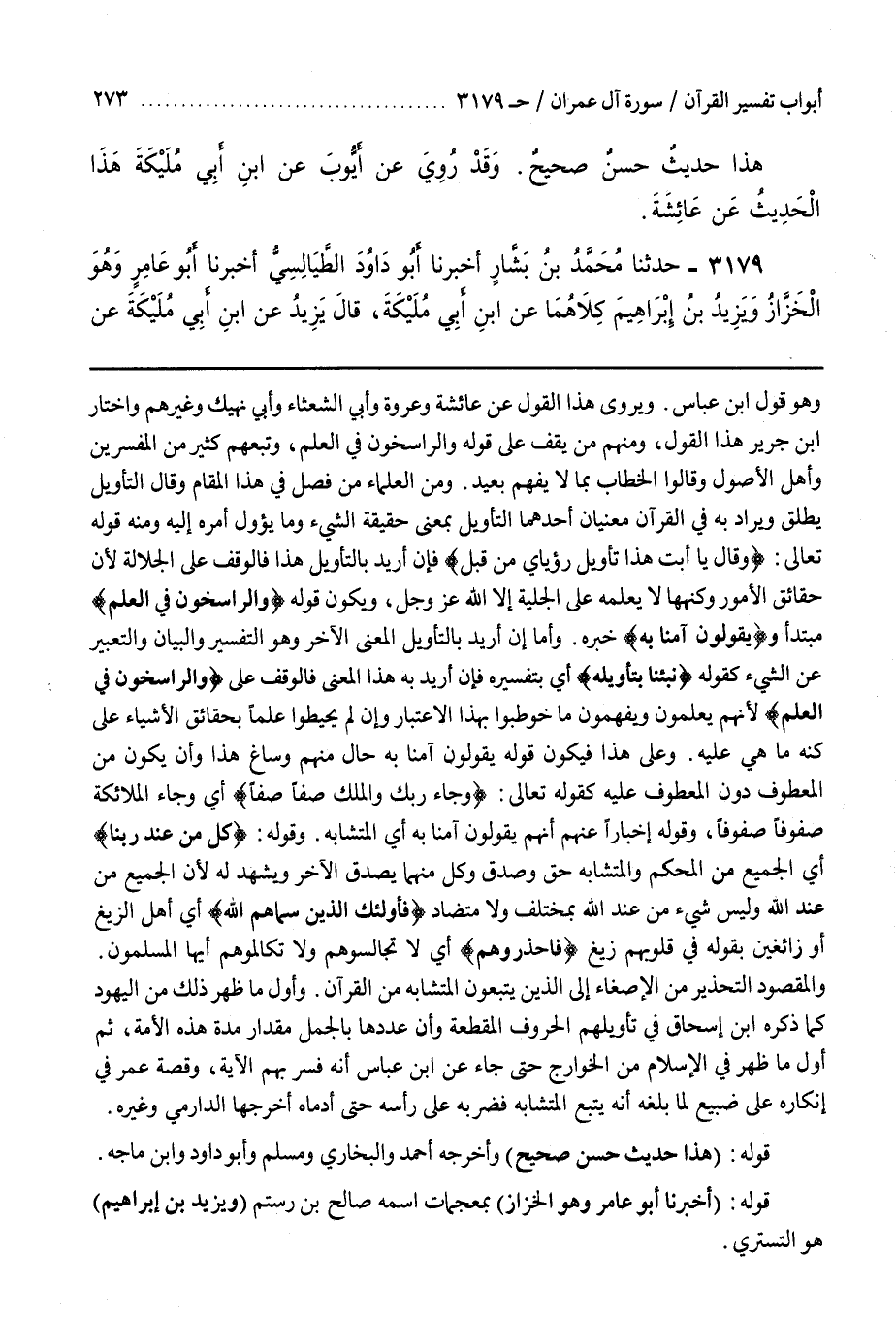 وَأَمَّا إِنْ أُرِيدَ بِالتَّأْوِيلِ الْمَعْنَى الْآخَرُ وَهُوَ التَّفْسِيرُ وَالْبَيَانُ وَالتَّعْبِيرُ عَنِ الشَّيْءِ كَقَوْلِهِ نَبِّئْنَا بِتَأْوِيلِهِ أَيْ بِتَفْسِيرِهِ فَإِنْ أُرِيدَ بِهِ الْمَعْنَى فَالْوَقْفُ عَلَى وَالرَّاسِخُونَ فِي الْعِلْمِ لِأَنَّهُمْ يَعْلَمُونَ وَيَفْهَمُونَ مَا خُوطِبُوا بِهِ بِهَذَا الِاعْتِبَارِ وَإِنْ لَمْ يُحِيطُوا عِلْمًا بِحَقَائِقِ الْأَشْيَاءِ عَلَى كُنْهِ مَا هِيَ عَلَيْهِ