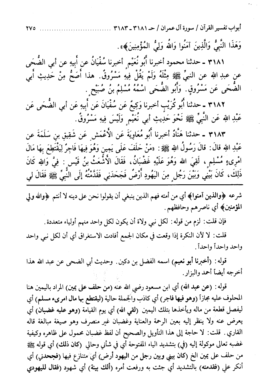 قُلْتُ لَا حَاجَةَ إِلَى هَذَا التَّأْوِيلِ وَالصَّحِيحُ أَنَّ لَفْظَ غَضْبَانُ مَحْمُولٌ عَلَى ظَاهِرِهِ وَكَيْفِيَّةُ غَضَبِهِ تَعَالَى مَوْكُولَةٌ إِلَيْهِ (فِيَّ) بِتَشْدِيدِ الْيَاءِ الْمَفْتُوحَةِ أَيْ فِي شَأْنِي وَحَالِي (كَانَ ذَلِكَ) أي قوله مَنْ حَلَفَ عَلَى يَمِينٍ إِلَخْ (كَانَ بَيْنِي وَبَيْنَ رَجُلٍ مِنَ الْيَهُودِ أَرْضٌ) أَيْ مُتَنَازَعٌ فِيهَا (فَجَحَدَنِي) أَيْ أَنْكَرَ عَلَيَّ (فَقَدَّمْته) بِالتَّشْدِيدِ أَيْ جِئْتَ بِهِ وَرَفَعْتَ أَمْرَهُ (أَلَكَ بَيِّنَةٌ) أَيْ شُهُودٌ (فَقَالَ لِلْيَهُودِيِّ احْلِفْ فِي شَرْحِ السُّنَّةِ فِيهِ دَلِيلٌ عَلَى أَنَّ الْكَافِرَ يَحْلِفُ فِي الْخُصُومَاتِ كَمَا يَحْلِفُ الْمُسْلِمُ (وَإِذَنْ) بِالنُّونِ (يَحْلِفَ) بِالنَّصْبِ فَأَنْزَلَ اللَّهُ تَبَارَكَ وَتَعَالَى إِنَّ الَّذِينَ يَشْتَرُونَ بِعَهْدِ اللَّهِ وَأَيْمَانِهِمْ ثَمَنًا قَلِيلًا إِلَى آخِرِ الْآيَةِ