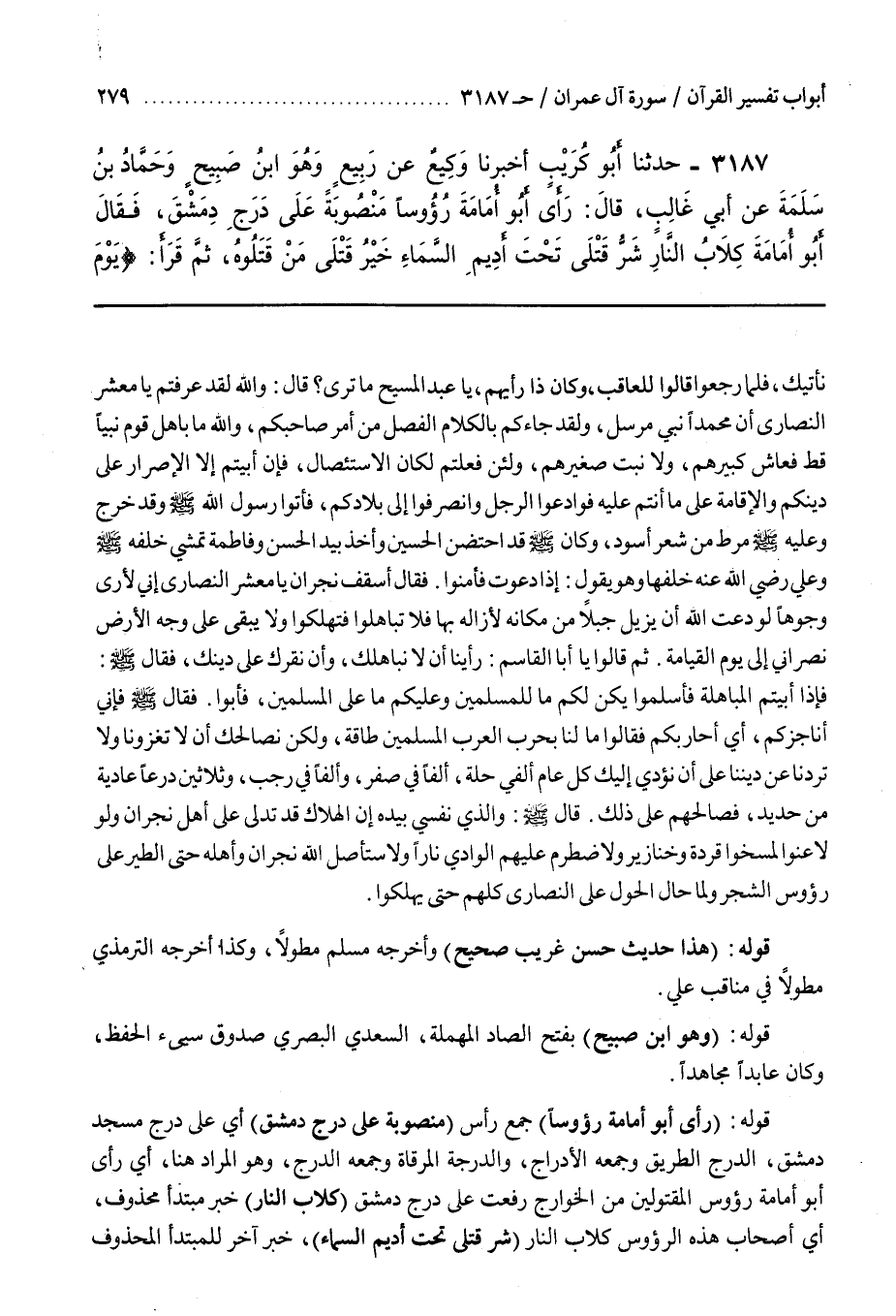 أَيْ رَأَى أَبُو أُمَامَةَ رؤوس الْمَقْتُولِينَ مِنَ الْخَوَارِجِ رُفِعَتْ عَلَى دَرَجِ دِمَشْقَ (كِلَابُ النَّارِ) خَبَرُ مُبْتَدَأٍ مَحْذُوفٍ أَيْ أَصْحَابُ هذا الرؤوس كِلَابُ النَّارِ (شَرُّ قَتْلَى تَحْتَ أَدِيمِ السَّمَاءِ) خَبَرٌ آخِّرَ لِلْمُبْتَدَأِ الْمَحْذُوفِ