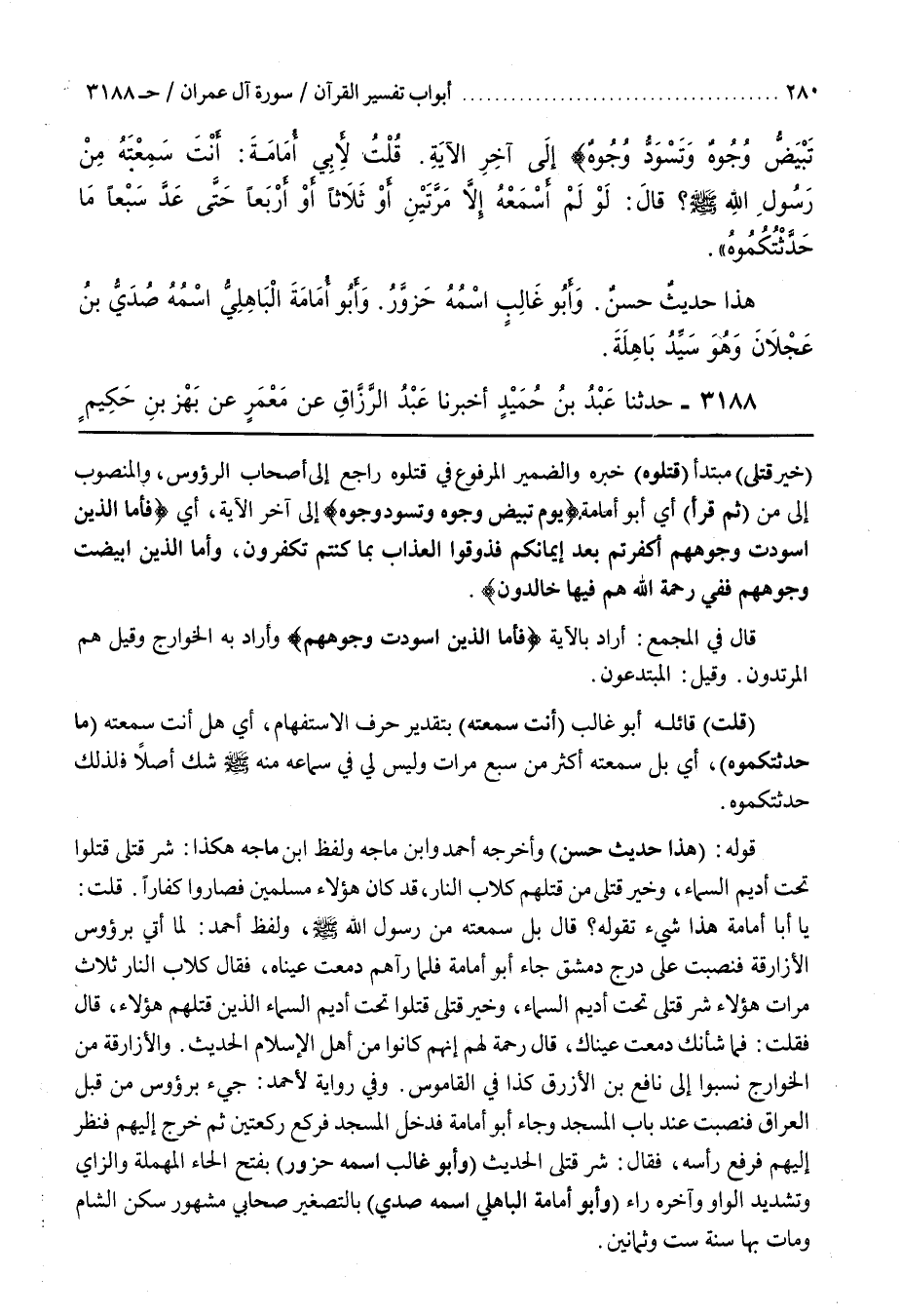 قُلْتُ يَا أَبَا أُمَامَةَ هَذَا شَيْءٌ تَقُولُهُ قَالَ بل سمعته من رسول الله ولفظ أحمد لما أتى برؤوس الْأَزَارِقَةِ فَنُصِبَتْ عَلَى دَرَجِ دِمَشْقَ جَاءَ أَبُو أُمَامَةَ فَلَمَّا رَآهُمْ دَمَعَتْ عَيْنَاهُ فَقَالَ كِلَابُ النَّارِ ثَلَاثَ مَرَّاتٍ هَؤُلَاءِ شَرُّ قَتْلَى قُتِلُوا تَحْتَ أَدِيمِ السَّمَاءِ وَخَيْرُ قَتْلَى قُتِلُوا تَحْتَ أَدِيمِ السَّمَاءِ الَّذِينَ قَتَلَهُمْ هَؤُلَاءِ قَالَ فَقُلْتُ فَمَا شَأْنُكَ دَمَعَتْ عَيْنَاك قَالَ رَحْمَةً لَهُمْ إِنَّهُمْ كَانُوا مِنْ أَهْلِ الْإِسْلَامِ الْحَدِيثَ وَالْأَزَارِقَةُ مِنَ الْخَوَارِجِ نُسِبُوا إِلَى نَافِعِ بْنِ الْأَزْرَقِ كَذَا فِي الْقَامُوسِ وَفِي رِوَايَةٍ لِأَحْمَدَ جِيءَ برؤوس مِنْ قِبَلِ الْعِرَاقِ فَنُصِبَتْ عِنْدَ بَابِ الْمَسْجِدِ وَجَاءَ أَبُو أُمَامَةَ فَدَخَلَ الْمَسْجِدَ فَرَكَعَ رَكْعَتَيْنِ ثُمَّ خَرَجَ إِلَيْهِمْ فَنَظَرَ إِلَيْهِمْ فَرَفَعَ رَأْسَهُ فَقَالَ شَرُّ قَتْلَى الْحَدِيثَ (وَأَبُو غَالِبٍ اسْمُهُ حَزَوَّرٌ) بِفَتْحِ الْحَاءِ الْمُهْمَلَةِ وَالزَّايِ وَتَشْدِيدِ الْوَاوِ وَآخِرُهُ رَاءٌ (وَأَبُو أُمَامَةَ الْبَاهِلِيُّ اسْمُهُ صُدَيٌّ) بِالتَّصْغِيرِ صَحَابِيٌّ مَشْهُورٌ سَكَنَ الشَّامَ وَمَاتَ بِهَا سَنَةَ سِتٍّ وَثَمَانِينَ