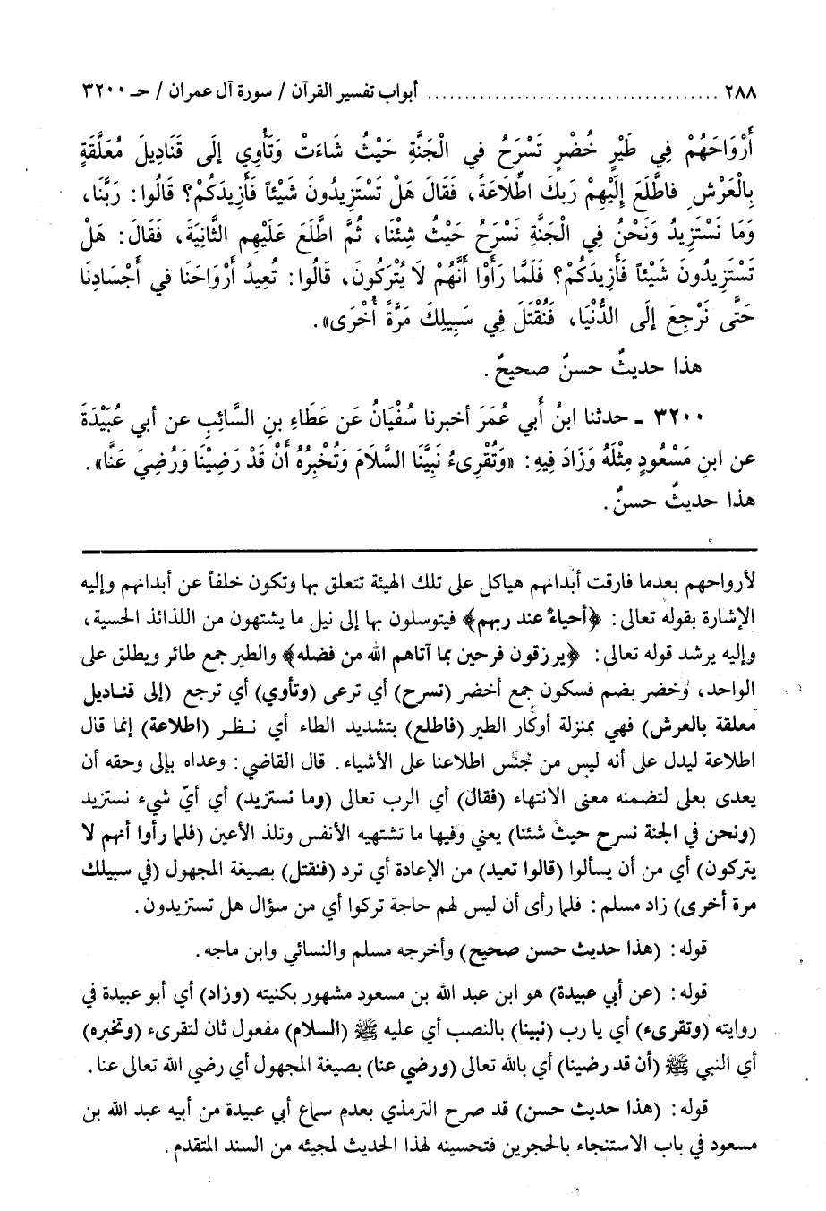 لِأَرْوَاحِهِمْ بَعْدَ مَا فَارَقَتْ أَبْدَانَهُمْ هَيَاكِلَ عَلَى تِلْكَ الْهَيْئَةِ تَتَعَلَّقُ بِهَا وَتَكُونُ خَلَفًا عَنْ أَبْدَانِهِمْ وَإِلَيْهِ الْإِشَارَةُ بِقَوْلِهِ تَعَالَى أَحْيَاءٌ عِنْدَ رَبِّهِمْ فَيَتَوَسَّلُونَ بِهَا إِلَى نَيْلِ مَا يَشْتَهُونَ مِنَ اللَّذَائِذِ الْحِسِّيَّةِ وَإِلَيْهِ يُرْشِدُ قَوْلُهُ تَعَالَى يُرْزَقُونَ فَرِحِينَ بِمَا آتَاهُمُ اللَّهُ مِنْ فَضْلِهِ وَالطَّيْرُ جَمْعُ طَائِرٍ وَيُطْلَقُ عَلَى الْوَاحِدِ وَخُضْرٌ بِضَمٍّ فَسُكُونٍ جَمْعُ أَخْضَرَ (تَسْرَحُ) أَيْ تَرْعَى (وَتَأْوِي) أَيْ تَرْجِعُ (إِلَى قَنَادِيلَ مُعَلَّقَةٍ بِالْعَرْشِ) فَهِيَ بِمَنْزِلَةِ أَوْكَارِ الطَّيْرِ (فَاطَّلَعَ) بِتَشْدِيدِ الطَّاءِ أي أنظري (اطِّلَاعَةً) إِنَّمَا قَالَ اطِّلَاعَةً لِيَدُلَّ عَلَى أَنَّهُ لَيْسَ مِنْ جِنْسِ اطِّلَاعِنَا عَلَى الْأَشْيَاءِ