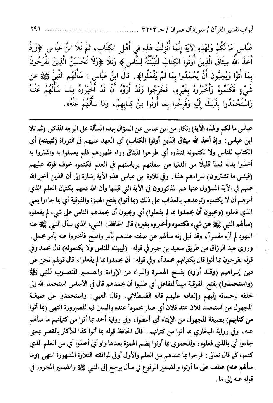 عباس مالكم ولهذه الاية) إنكار من بن عَبَّاسٍ عَنِ السُّؤَالِ بِهَذِهِ الْمَسْأَلَةِ عَلَى الْوَجْهِ المذكور (ثم تلا بن عَبَّاسٍ وَإِذْ أَخَذَ اللَّهُ مِيثَاقَ الَّذِينَ أُوتُوا الكتاب) أَيِ الْعَهْدَ عَلَيْهِمْ فِي التَّوْرَاةِ (لِتُبَيِّنُنَّهُ) أَيِ الْكِتَابَ لِلنَّاسِ وَلَا تَكْتُمُونَهُ فَنَبَذُوهُ أَيْ طَرَحُوا الْمِيثَاقَ وَرَاءَ ظُهُورِهِمْ فَلَمْ يَعْمَلُوا بِهِ وَاشْتَرَوْا بِهِ أَخَذُوا بَدَلَهُ ثَمَنًا قَلِيلًا مِنَ الدُّنْيَا مِنْ سَفَلَتِهِمْ بِرِيَاسَتِهِمْ فِي الْعِلْمِ فَكَتَمُوهُ خَوْفَ فَوْتِهِ عَلَيْهِمْ (فَبِئْسَ مَا يَشْتَرُونَ) شِرَاءَهُمْ هَذَا