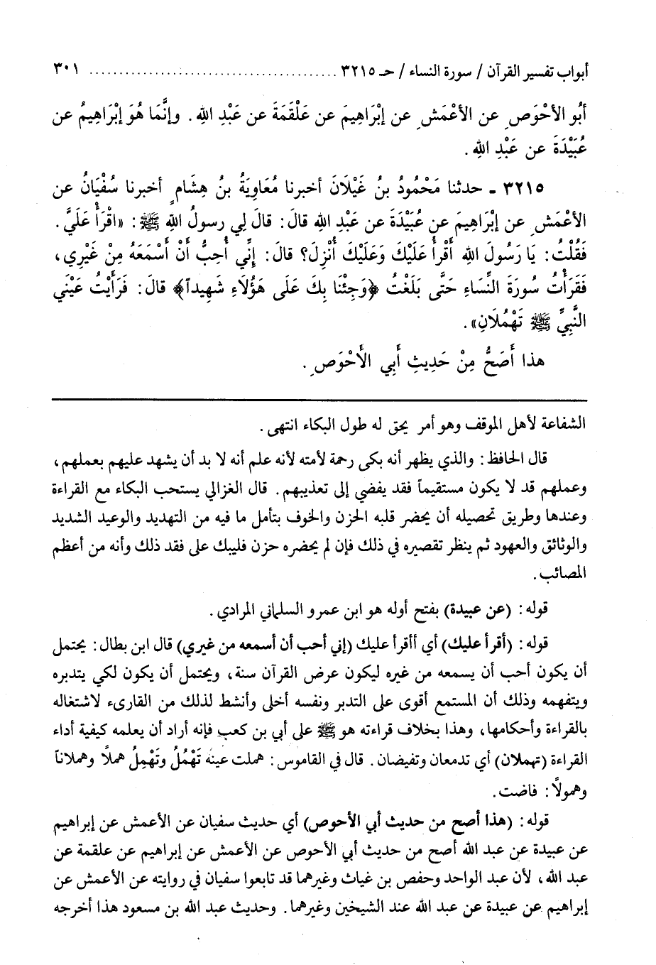 قَالَ الْحَافِظُ وَالَّذِي يَظْهَرُ أَنَّهُ بَكَى رَحْمَةً لِأُمَّتِهِ لِأَنَّهُ عَلِمَ أَنَّهُ لَا بُدَّ أَنْ يَشْهَدَ عَلَيْهِمْ بِعَمَلِهِمْ وَعَمَلُهُمْ قَدْ لَا يَكُونُ مُسْتَقِيمًا فَقَدْ يُفْضِي إِلَى تَعْذِيبِهِمْ
