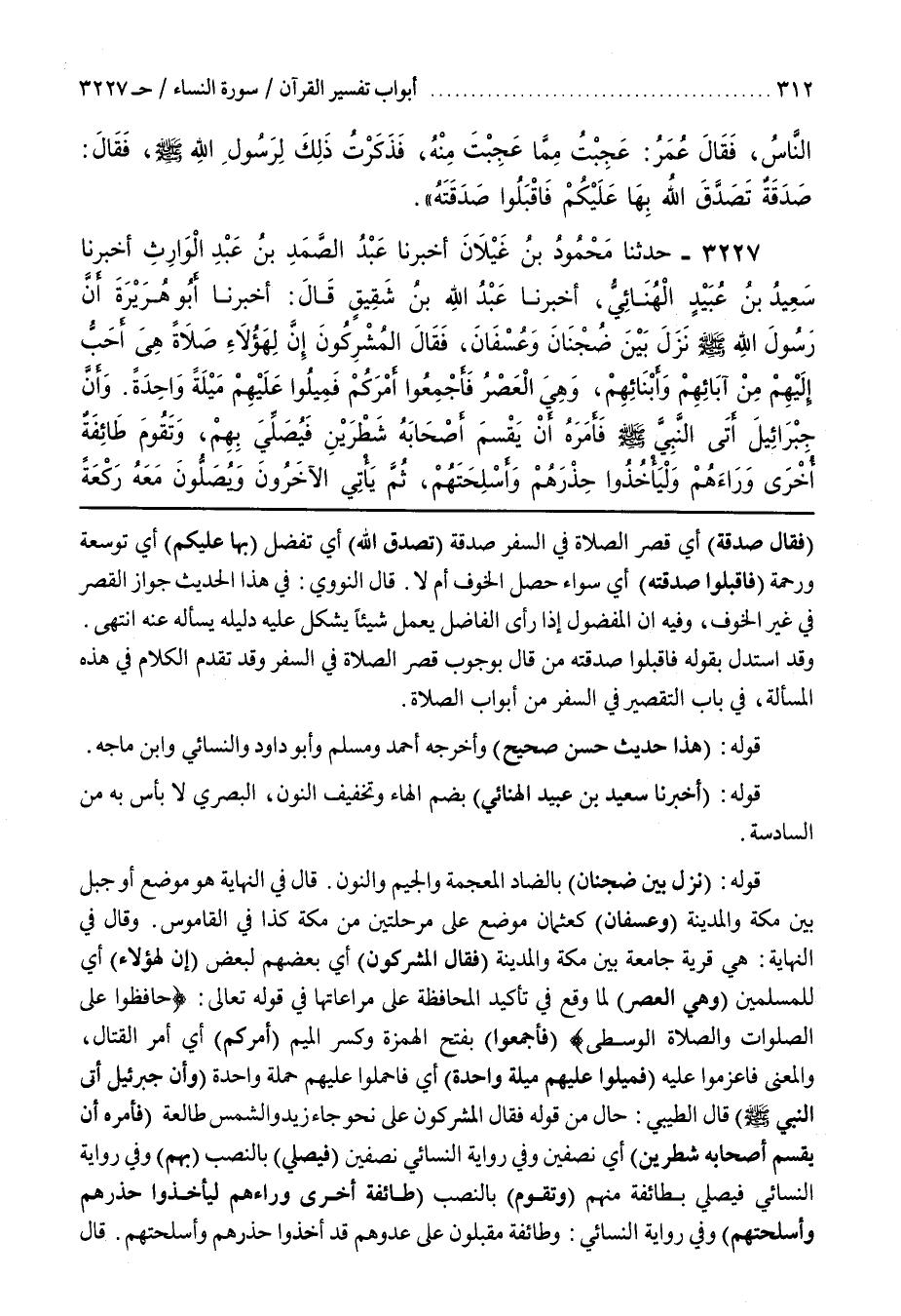 وَقَالَ فِي النِّهَايَةِ هِيَ قَرْيَةٌ جَامِعَةٌ بَيْنَ مَكَّةَ وَالْمَدِينَةِ (فَقَالَ الْمُشْرِكُونَ) أَيْ بَعْضُهُمْ لِبَعْضٍ (إِنَّ لِهَؤُلَاءِ) أَيْ لِلْمُسْلِمِينَ (وَهِيَ الْعَصْرُ) لِمَا وَقَعَ فِي تَأْكِيدِ الْمُحَافَظَةِ عَلَى مُرَاعَاتِهَا فِي قَوْلِهِ تَعَالَى حَافِظُوا عَلَى الصلوات والصلاة الوسطى (فَأَجْمِعُوا) بِفَتْحِ الْهَمْزَةِ وَكَسْرِ الْمِيمِ (أَمْرَكُمْ) أَيْ أَمْرَ الْقِتَالِ وَالْمَعْنَى فَاعْزِمُوا عَلَيْهِ (فَمِيلُوا عَلَيْهِمْ مَيْلَةً وَاحِدَةً) أَيْ فَاحْمِلُوا عَلَيْهِمْ حَمَلَةً وَاحِدَةً (وأن جبرائيل أتى النبي) قَالَ الطِّيبِيُّ حَالٌ مِنْ قَوْلِهِ فَقَالَ الْمُشْرِكُونَ عَلَى نَحْوِ جَاءَ زَيْدٌ وَالشَّمْسُ طَالِعَةٌ فَأَمَرَهُ أَنْ يَقْسِمَ أَصْحَابَهُ شَطْرَيْنِ أَيْ نِصْفَيْنِ وَفِي رِوَايَةِ النَّسَائِيِّ نِصْفَيْنِ (فَيُصَلِّيَ) بِالنَّصِّب (بِهِمْ) وَفِي رِوَايَةِ النَّسَائِيِّ فَيُصَلِّيَ بِطَائِفَةٍ مِنْهُمْ (وَتَقُومَ) بِالنَّصْبِ (طَائِفَةٌ أُخْرَى وَرَاءَهُمْ لِيَأْخُذُوا حِذْرَهُمْ وَأَسْلِحَتَهُمْ) وَفِي رِوَايَةِ النَّسَائِيِّ وَطَائِفَةٌ مُقْبِلُونَ عَلَى عَدُوِّهِمْ قَدْ أَخَذُوا حِذْرَهُمْ وَأَسْلِحَتَهُمْ
