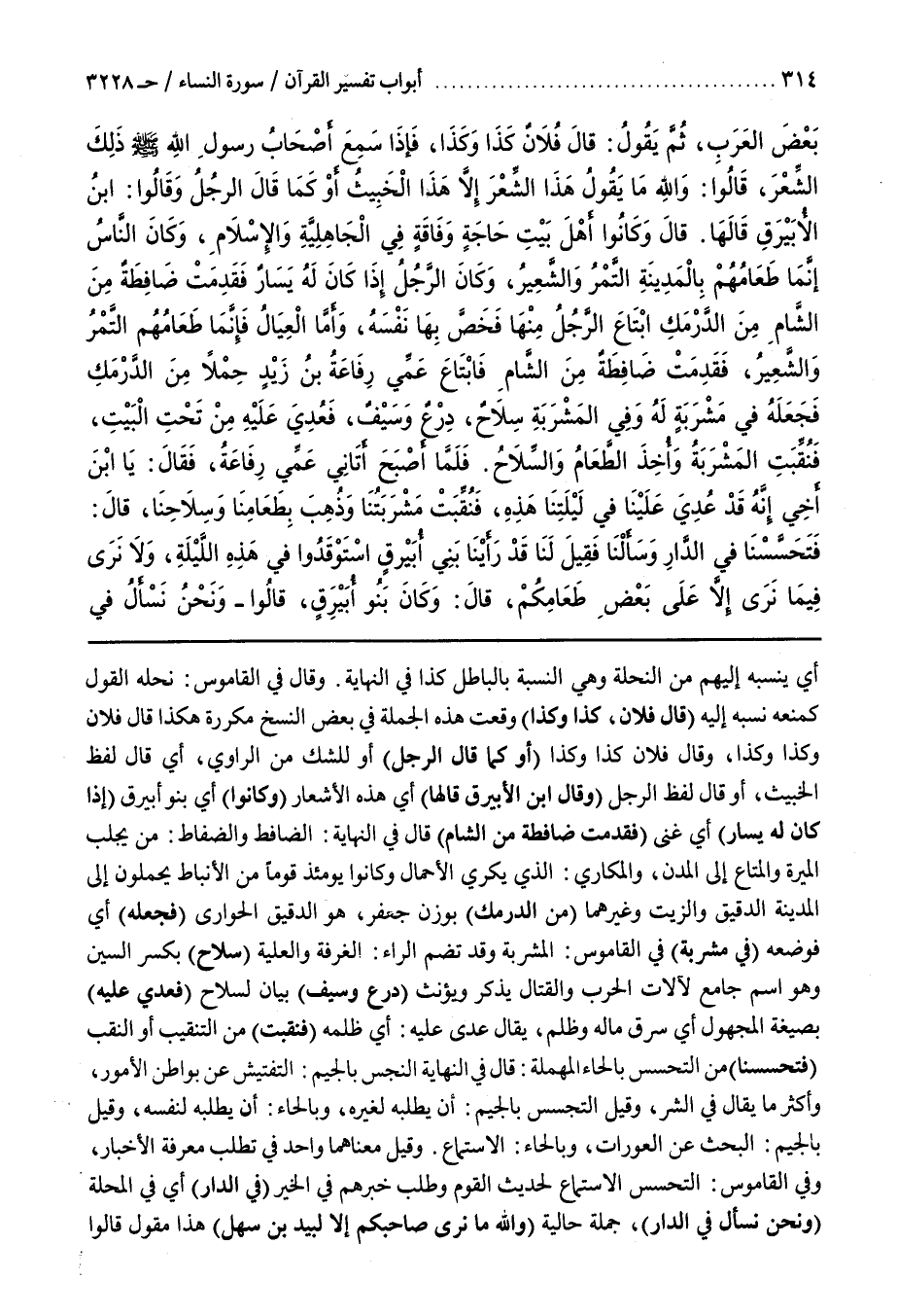 أَوْ قَالَ لَفْظَ الرَّجُلِ (وَقَالَ بن الْأُبَيْرِقِ قَالَهَا) أَيْ هَذِهِ الْأَشْعَارَ (وَكَانُوا) أَيْ بَنُو أُبَيْرِقٍ (إِذَا كَانَ لَهُ يَسَارٌ) أَيْ غِنًى (فَقَدِمَتْ ضَافِطَةٌ مِنَ الشَّامِ) قَالَ فِي النِّهَايَةِ الضَّافِطُ وَالضَّفَّاطُ مَنْ يَجْلِبُ الْمِيرَةَ وَالْمَتَاعَ إِلَى الْمُدُنِ وَالْمُكَارِي الَّذِي يُكْرِي الْأَحْمَالَ وَكَانُوا يَوْمَئِذٍ قَوْمًا مِنَ الْأَنْبَاطِ يَحْمِلُونَ إِلَى الْمَدِينَةِ الدَّقِيقَ وَالزَّيْتَ وَغَيْرَهُمَا (مِنَ الدَّرْمَكِ) بِوَزْنِ جَعْفَرٍ هُوَ الدَّقِيقُ الْحَوَارِيُّ (فَجَعَلَهُ) أَيْ فَوَضَعَهُ (فِي مَشْرَبَةٍ) فِي الْقَامُوسِ الْمَشْرَبَةُ وَقَدْ تُضَمُّ الرَّاءُ الْغُرْفَةُ وَالْعَلِيَّةُ (سِلَاحٌ) بِكَسْرِ السِّينِ وَهُوَ اسْمٌ جَامِعٌ لِآلَاتِ الْحَرْبِ وَالْقِتَالِ يُذَكَّرُ وَيُؤَنَّثُ (دِرْعٌ وسيف) بيان لسلاح (فَعُدِيَ عَلَيْهِ) بِصِيغَةِ الْمَجْهُولِ أَيْ سُرِقَ مَالُهُ وظلم يقال عدى عَلَيْهِ أَيْ ظَلَمَهُ (فَنُقِّبَتْ) مِنَ التَّنْقِيبِ أَوِ النَّقْبِ (فَتَحَسَّسْنَا) مِنَ التَّحَسُّسِ بِالْحَاءِ الْمُهْمَلَةِ قَالَ فِي النِّهَايَةِ التَّجَسُّسِ بِالْجِيمِ التَّفْتِيشُ عَنْ بَوَاطِنِ الْأُمُورِ وَأَكْثَرُ مَا يُقَالُ فِي الشَّرِّ وَقِيلَ التَّجَسُّسُ بِالْجِيمِ أَنْ يَطْلُبَهُ لِغَيْرِهِ وَبِالْحَاءِ أَنْ يَطْلُبَهُ لِنَفْسِهِ وَقِيلَ بِالْجِيمِ الْبَحْثُ عَنِ الْعَوْرَاتِ وَبِالْحَاءِ الِاسْتِمَاعُ