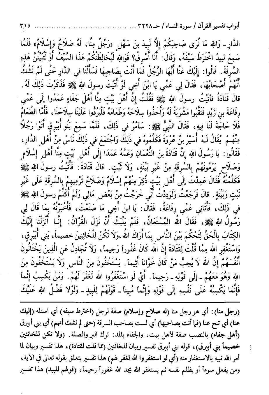 (وَلَا تَكُنْ لِلْخَائِنِينَ خصيما بَنِي أُبَيْرِقٍ) قَوْلُهُ بَنِي أُبَيْرِقٍ تَفْسِيرٌ وَبَيَانٌ لِلْخَائِنِينَ (مِمَّا قُلْتَ لِقَتَادَةَ) هَذَا تَفْسِيرٌ وَبَيَانٌ لِمَا أَمَرَ اللَّهُ نَبِيَّهُ بِالِاسْتِغْفَارِ مِنْهُ (أَيْ لَوِ اسْتَغْفَرُوا اللَّهَ لَغَفَرَ لَهُمْ) هَذَا تَفْسِيرٌ يتعلق بقوله تعالى في الاية ومن يفعل سُوءًا أَوْ يَظْلِمْ نَفْسَهُ ثُمَّ يَسْتَغْفِرِ اللَّهَ يجد الله غفورا رحيما (قَوْلُهُمْ لِلَبِيدٍ) هَذَا تَفْسِيرٌ