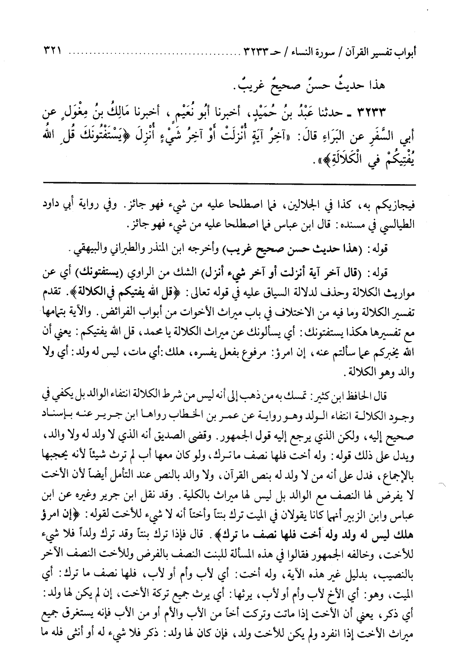 وَالْآيَةُ بِتَمَامِهَا مَعَ تَفْسِيرِهَا هَكَذَا يَسْتَفْتُونَكَ أَيْ يَسْأَلُونَكَ عَنْ مِيرَاثِ الْكَلَالَةِ يَا مُحَمَّدُ قُلِ الله يفتيكم يَعْنِي أَنَّ اللَّهَ يُخْبِرُكُمْ عَمَّا سَأَلْتُمْ عَنْهُ إِنِ امْرُؤُ مَرْفُوعٌ بِفِعْلٍ يُفَسِّرُهُ هَلَكَ أَيْ مَاتَ لَيْسَ لَهُ وَلَدٌ أَيْ وَلَا وَالِدٌ وهو الكلالة