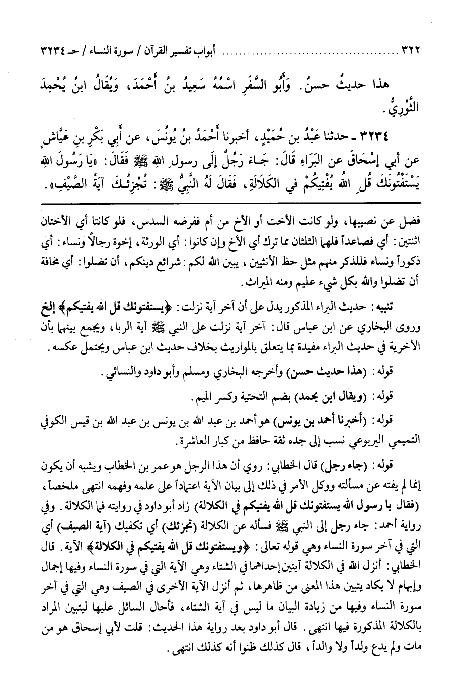 وَفِي رِوَايَةِ أَحْمَدَ جَاءَ رَجُلٌ إِلَى النَّبِيِّ فَسَأَلَهُ عَنِ الْكَلَالَةِ (تُجْزِئُكَ) أَيْ تَكْفِيَكَ (آيَةُ الصيف) أي التي فِي آخِرِ سُورَةِ النِّسَاءِ وَهِيَ قَوْلُهُ تَعَالَى ويستفتونك قل الله يفتيكم في الكلالة الْآيَةَ قَالَ الْخَطَّابِيُّ أَنْزَلَ اللَّهُ فِي الْكَلَالَةِ آيَتَيْنِ أَحَدُهُمَا فِي الشِّتَاءِ وَهِيَ الْآيَةُ الَّتِي فِي سُورَةِ النِّسَاءِ وَفِيهَا إِجْمَالٌ وَإِبْهَامٌ لَا يَكَادُ يَتَبَيَّنُ هَذَا الْمَعْنَى مِنْ ظَاهِرِهَا ثُمَّ أَنْزَلَ الْآيَةَ الْأُخْرَى فِي الصَّيْفِ وَهِيَ الَّتِي فِي آخِرِ سُورَةِ النِّسَاءِ وَفِيهَا مِنْ زِيَادَةِ الْبَيَانِ مَا لَيْسَ فِي آيَةِ الشِّتَاءِ فَأَحَالَ السَّائِلَ عَلَيْهَا لِيَتَبَيَّنَ الْمُرَادَ بِالْكَلَالَةِ الْمَذْكُورَةِ فِيهَا انْتَهَى