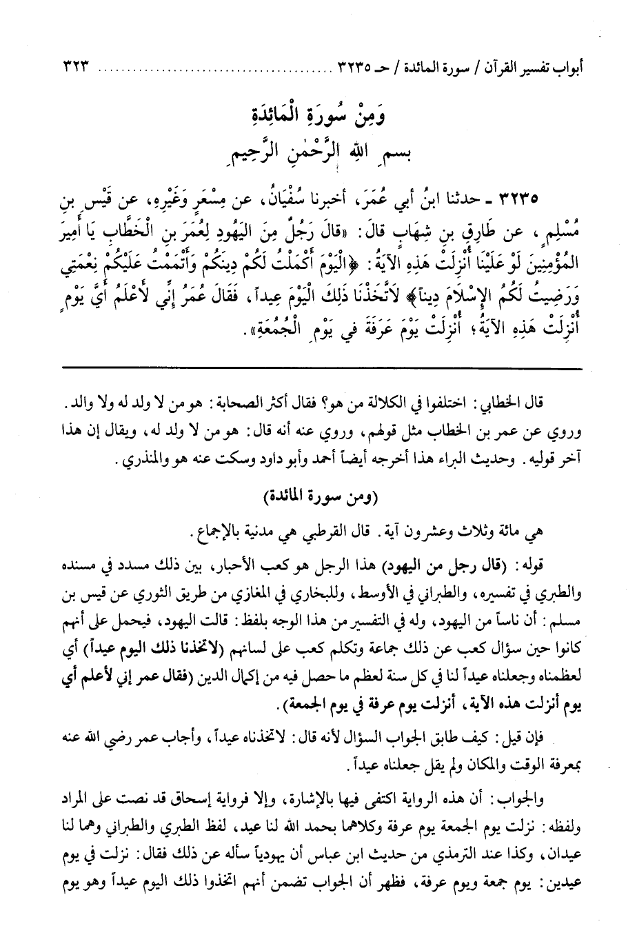 أَنَّ نَاسًا مِنَ الْيَهُودِ وَلَهُ فِي التَّفْسِيرِ مِنْ هَذَا الْوَجْهِ بِلَفْظِ قَالَتِ الْيَهُودُ فَيُحْمَلُ عَلَى أَنَّهُمْ كَانُوا حِينَ سُؤَالِ كَعْبٍ عَنْ ذَلِكَ جماعة وتكلم كعب على لسانهم (لا تخذنا ذَلِكَ الْيَوْمَ عِيدًا) أَيْ لَعَظَّمْنَاهُ وَجَعَلْنَاهُ عِيدًا لَنَا فِي كُلِّ سَنَةٍ لِعِظَمِ مَا حَصَلَ فِيهِ مِنْ إِكْمَالِ الدِّينِ (فَقَالَ عُمَرُ إِنِّي لَأَعْلَمُ أَيَّ يَوْمٍ أُنْزِلَتْ هَذِهِ الْآيَةُ أُنْزِلَتْ يَوْمَ عَرَفَةَ فِي يَوْمِ الْجُمُعَة)