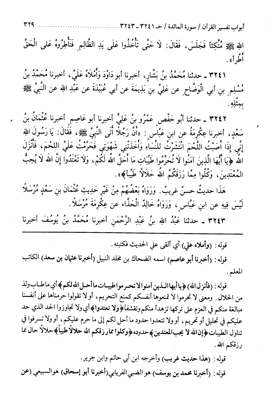 وَمَعْنَى لَا تُحَرِّمُوا لَا تَمْنَعُوهَا أَنْفُسَكُمْ كَمَنْعِ التَّحْرِيمِ أَوْ لَا تَقُولُوا حَرَّمْنَاهَا عَلَى أَنْفُسِنَا مُبَالَغَةً مِنْكُمْ فِي الْعَزْمِ عَلَى تَرْكِهَا تَزَهُّدًا مِنْكُمْ وَتَقَشُّفًا وَلَا تَعْتَدُوا أَيْ وَلَا تُجَاوِزُوا الْحَدَّ الَّذِي حَدَّ عَلَيْكُمْ فِي تَحْلِيلٍ أَوْ تَحْرِيمٍ أَوْ وَلَا تَتَعَدَّوْا حُدُودَ مَا أَحَلَّ لَكُمْ إِلَى مَا حَرَّمَ عَلَيْكُمْ أَوْ وَلَا تُسْرِفُوا فِي تَنَاوُلِ الطَّيِّبَاتِ إِنَّ اللَّهَ لَا يُحِبُّ المعتدين حُدُودَهُ وَكُلُوا مِمَّا رَزَقَكُمُ اللَّهُ حَلَالًا طَيِّبًا حَلَالًا حَالٌ مِمَّا رَزَقَكُمُ اللَّهُ قَوْلُهُ (هَذَا حديث غريب) وأخرجه بن أبي حاتم وبن جرير
