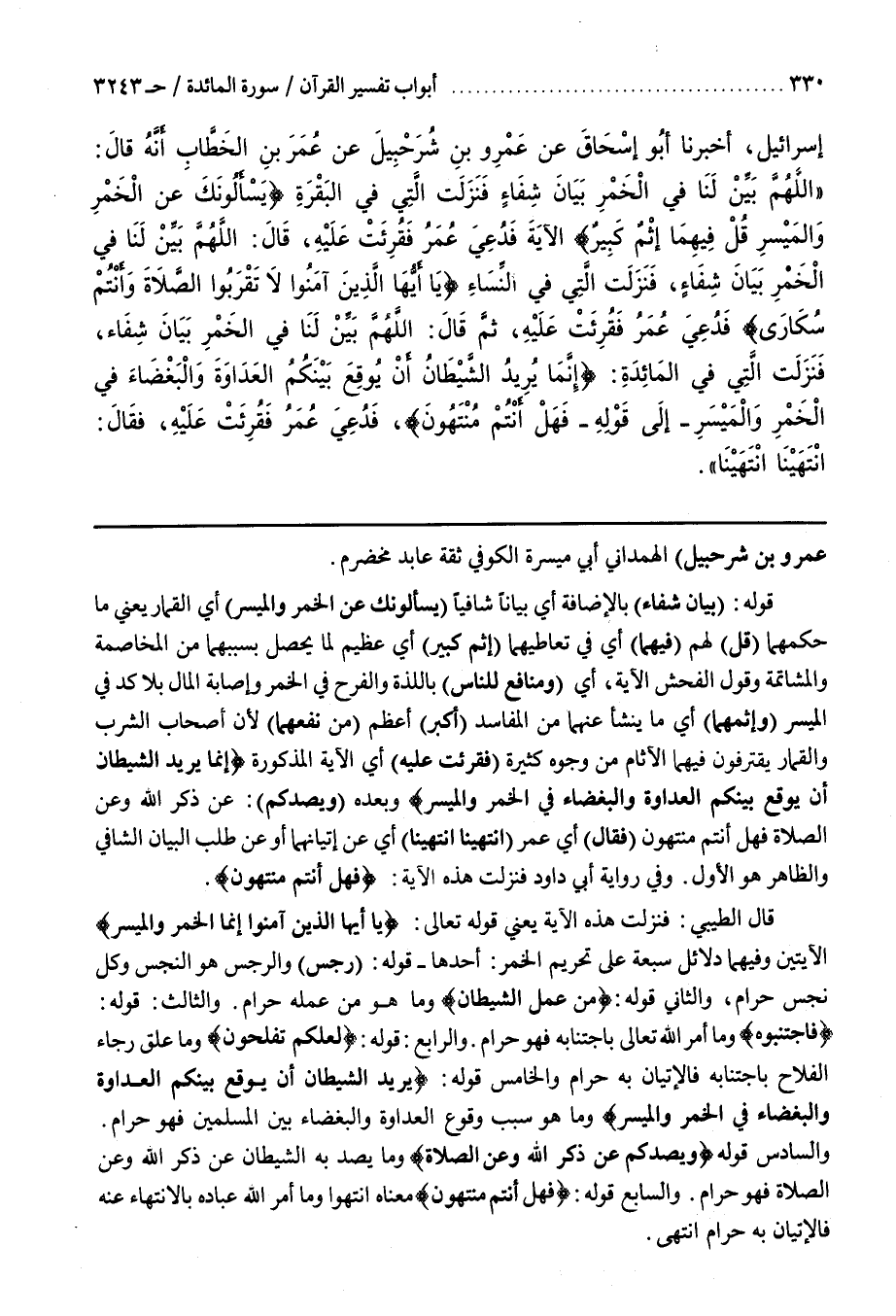 عمرو بْنِ شُرَحْبِيلَ) الْهَمْدَانِيِّ أَبِي مَيْسَرَةَ الْكُوفِيِّ ثِقَةٌ أَيِ الْقِمَارِ يَعْنِي مَا حُكْمُهُمَا قُلْ لَهُمْ فِيهِمَا أَيْ فِي تَعَاطِيهِمَا إِثْمٌ كَبِيرٌ أَيْ عَظِيمٌ لِمَا يَحْصُلُ بِسَبَبِهِمَا مِنَ الْمُخَاصَمَةِ وَالْمُشَاتَمَةِ وَقَوْلِ الْفُحْشِ الْآيَةَ أَيْ وَمَنَافِعُ لِلنَّاسِ بِاللَّذَّةِ وَالْفَرَحِ فِي الْخَمْرِ وَإِصَابَةِ الْمَالِ بِلَا كَدٍّ فِي الْمَيْسِرِ وَإِثْمُهُمَا أَيْ مَا يَنْشَأُ عَنْهُمَا مِنَ الْمَفَاسِدِ أَكْبَرُ أَعْظَمُ مِنْ نَفْعِهِمَا لِأَنَّ أَصْحَابَ الشُّرْبِ وَالْقِمَارِ يَقْتَرِفُونَ فِيهِمَا الْآثَامَ مِنْ وُجُوهٍ كَثِيرَةٍ (فَقُرِئَتْ عَلَيْهِ) أَيِ الْآيَةُ الْمَذْكُورَةُ إنما يريد الشيطان أن يوقع بينكم لعداوة والبغضاء في الخمر والميسر وَبَعْدَهُ وَيَصُدَّكُمْ عَنْ ذِكْرِ اللَّهِ وَعَنِ الصَّلَاةِ فهل أنتم منتهون (فَقَالَ) أَيْ عُمَرُ (انْتَهَيْنَا انْتَهَيْنَا) أَيْ عَنْ إِتْيَانِهِمَا أَوْ عَنْ طَلَبِ الْبَيَانِ الشَّافِي وَالظَّاهِرُ هُوَ الْأَوَّلُ