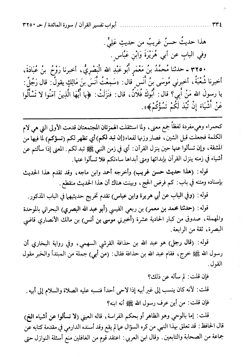 فَإِنْ قُلْتَ مِنْ أين عرف رسول الله أَنَّهُ ابْنُهُ قُلْتُ إِمَّا بِالْوَحْيِ وَهُوَ الظَّاهِرُ أَوْ بِحُكْمِ الْفَرَاسَةِ قَالَهُ الْعَيْنِيُّ (لَا تَسْأَلُوا عَنْ أَشْيَاءَ إِلَخْ) قَالَ الْحَافِظُ قَدْ تَعَلَّقَ بِهَذَا النَّهْيِ مَنْ كَرِهَ السُّؤَالَ عَمَّا لَمْ يَقَعْ وَقَدْ أَسْنَدَهُ الدَّارِمِيُّ فِي مُقَدِّمَةِ كِتَابِهِ عن جماعة من الصحابة والتابعين