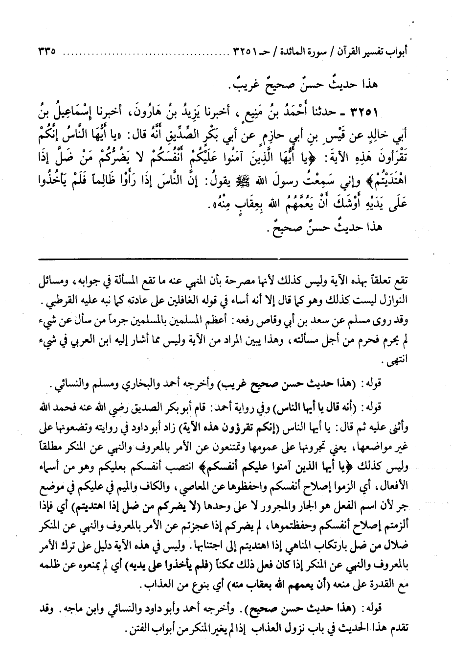 قَوْلُهُ (أَنَّهُ قَالَ يَا أَيُّهَا النَّاسُ) وَفِي رِوَايَةِ أَحْمَدَ قَامَ أَبُو بَكْرٍ الصِّدِّيقُ رَضِيَ اللَّهُ عَنْهُ فَحَمِدَ اللَّهَ وَأَثْنَى عَلَيْهِ ثم قال يا أيها الناس (إنكم تقرؤون هَذِهِ الْآيَةَ) زَادَ أَبُو دَاوُدَ فِي رِوَايَتِهِ وَتَضَعُونَهَا عَلَى غَيْرِ مَوَاضِعِهَا يَعْنِي تُجْرُونَهَا عَلَى عُمُومِهَا وَتَمْتَنِعُونَ عَنِ الْأَمْرِ بِالْمَعْرُوفِ وَالنَّهْيِ عَنِ الْمُنْكَرِ مُطْلَقًا وَلَيْسَ كَذَلِكَ يَا أَيُّهَا الَّذِينَ آمنوا عليكم أنفسكم انْتَصَبَ أَنْفُسَكُمْ بِعَلَيْكُمْ وَهُوَ مِنْ أَسْمَاءِ الْأَفْعَالِ أَيِ الْزَمُوا إِصْلَاحَ أَنْفُسِكُمْ وَاحْفَظُوهَا عَنِ الْمَعَاصِي وَالْكَافُ وَالْمِيمُ فِي عَلَيْكُمْ فِي مَوْضِعِ جَرٍّ لِأَنَّ اسْمَ الْفِعْلِ هُوَ الْجَارُّ وَالْمَجْرُورُ لَا عَلَى وَحْدِهَا لَا يَضُرُّكُمْ مَنْ ضَلَّ إِذَا اهتديتم أَيْ فَإِذَا أَلْزَمْتُمْ إِصْلَاحَ أَنْفُسِكُمْ وَحَفِظْتُمُوهَا لَمْ يَضُرَّكُمْ إِذَا عَجَزْتُمْ عَنِ الْأَمْرِ بِالْمَعْرُوفِ وَالنَّهْيِ عَنِ الْمُنْكَرِ ضَلَالُ مَنْ ضَلَّ بِارْتِكَابِ الْمَنَاهِي إذا اهتديتم اجْتِنَابِهَا