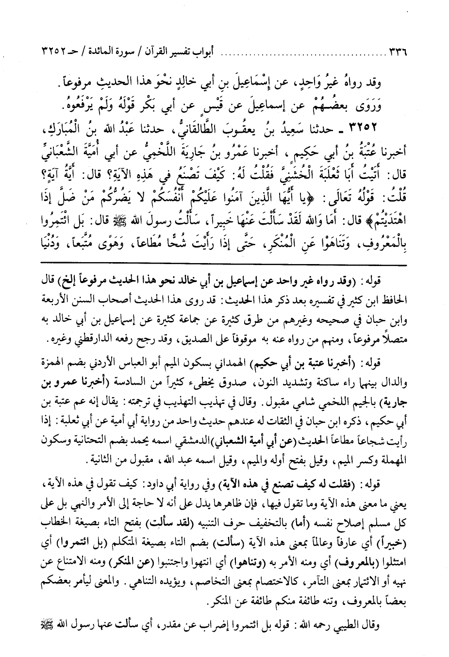 قَوْلُهُ (فَقُلْتَ لَهُ كَيْفَ تَصْنَعُ فِي هَذِهِ الْآيَةِ) وَفِي رِوَايَةِ أَبِي دَاوُدَ كَيْفَ تَقُولُ فِي هَذِهِ الْآيَةِ يَعْنِي مَا مَعْنَى هَذِهِ الْآيَةِ وَمَا تَقُولُ فِيهَا فَإِنَّ ظَاهِرَهَا يَدُلُّ عَلَى أَنَّهُ لَا حَاجَةَ إِلَى الْأَمْرِ وَالنَّهْيِ بَلْ عَلَى كُلِّ مُسْلِمٍ إِصْلَاحُ نَفْسِهِ (أَمَا) بِالتَّخْفِيفِ حَرْفُ التَّنْبِيهِ (لَقَدْ سَأَلْتَ) بِفَتْحِ التَّاءِ بِصِيغَةِ الْخِطَابِ (خَبِيرًا) أَيْ عَارِفًا وَعَالِمًا بِمَعْنَى هَذِهِ الْآيَةِ (سَأَلْتُ) بِضَمِّ التَّاءِ بِصِيغَةِ الْمُتَكَلِّمِ (بَلِ ائْتَمَرُوا) أَيِ امْتَثِلُوا (بِالْمَعْرُوفِ) أَيْ وَمِنْهُ الْأَمْرُ بِهِ (وَتَنَاهَوْا) أَيِ انْتَهُوا وَاجْتَنِبُوا (عَنِ الْمُنْكَرِ) وَمِنْهُ الِامْتِنَاعُ عَنْ نَهْيِهِ أَوِ الِائْتِمَارِ بِمَعْنَى التَّآمُرِ كَالِاخْتِصَامِ بِمَعْنَى التَّخَاصُمِ وَيُؤَيِّدُهُ التَّنَاهِي