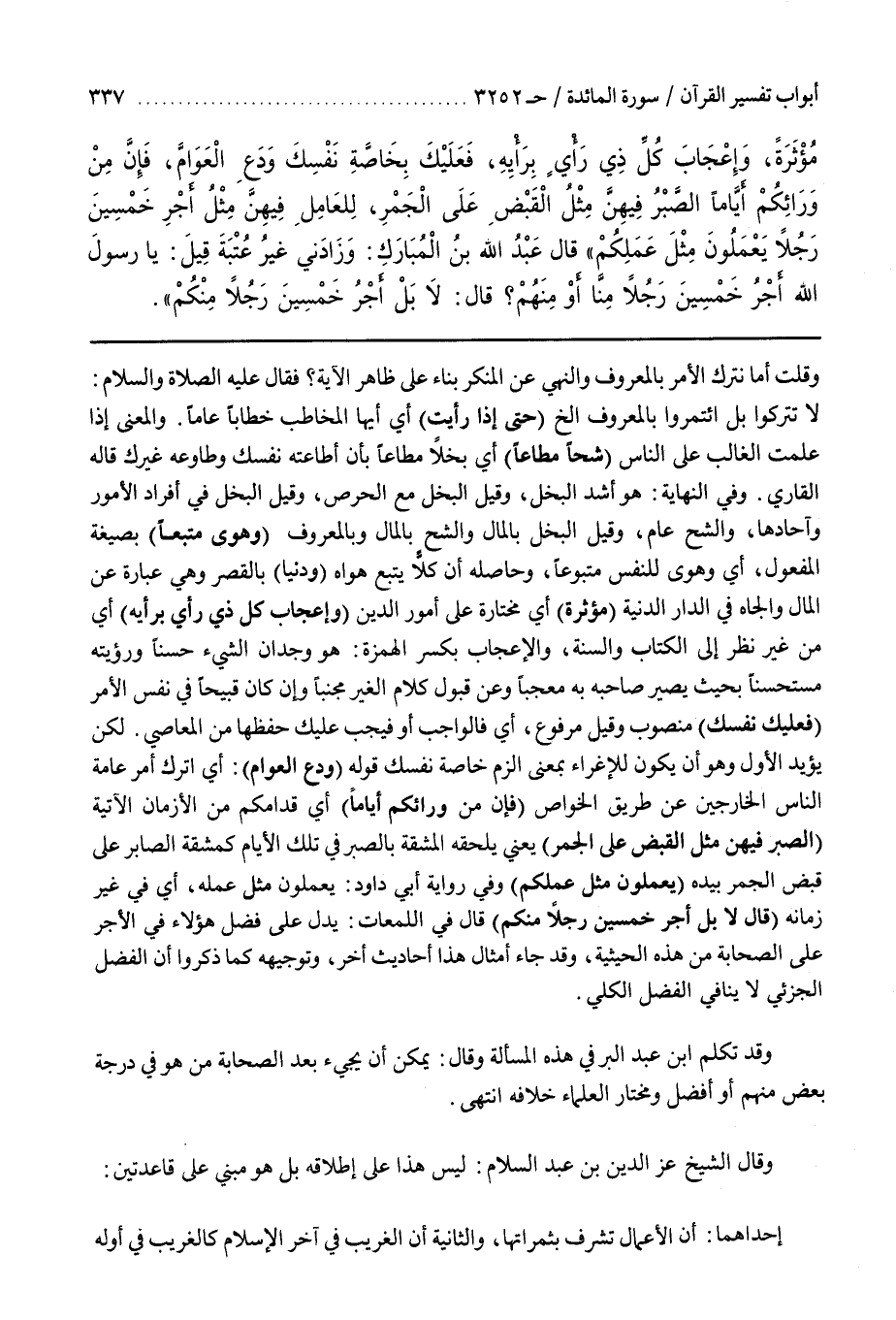 لَكِنْ يُؤَيِّدُ الْأَوَّلَ وَهُوَ أَنْ يَكُونَ لِلْإِغْرَاءِ بِمَعْنَى الْزَمْ خَاصَّةَ نَفْسِك قَوْلُهُ (وَدَعِ الْعَوَامَّ) أَيِ اتْرُكْ أَمْرَ عَامَّةِ النَّاسِ الْخَارِجِينَ عَنْ طريق الخواص (فإن من وراءكم أَيَّامًا) أَيْ قُدَّامَكُمْ مِنَ الْأَزْمَانِ الْآتِيَةِ (الصَّبْرُ فِيهِنَّ مِثْلُ الْقَبْضِ عَلَى الْجَمْرِ) يَعْنِي يَلْحَقُهُ الْمَشَقَّةُ بِالصَّبْرِ فِي تِلْكَ الْأَيَّامِ كَمَشَقَّةِ الصَّابِرِ عَلَى قَبْضِ الْجَمْرِ بِيَدِهِ (يَعْمَلُونَ مِثْلَ عَمَلِكُمْ)