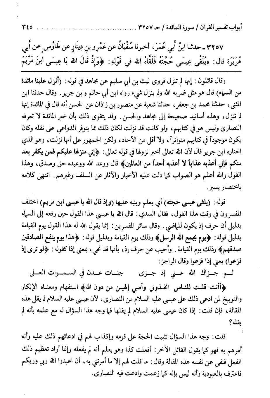 وَقَدْ يَتَقَوَّى ذَلِكَ بِأَنَّ خَبَرَ الْمَائِدَةِ لَا تَعْرِفُهُ النَّصَارَى وَلَيْسَ هُوَ فِي كِتَابِهِمْ وَلَوْ كَانَتْ قَدْ نَزَلَتْ لَكَانَ ذَلِكَ مِمَّا يَتَوَفَّرُ الدَّوَاعِي عَلَى نَقْلِهِ وَكَانَ يَكُونُ مَوْجُودًا فِي كِتَابِهِمْ مُتَوَاتِرًا وَلَا أَقَلَّ مِنَ الْآحَادِ وَلَكِنَّ الْجُمْهُورَ عَلَى أنها نزلت وهو الذي اختاره بن جَرِيرٍ قَالَ لِأَنَّ اللَّهَ تَعَالَى أَخْبَرَ نُزُولَهَا فِي قَوْلِهِ تَعَالَى إِنِّي مُنَزِّلُهَا عَلَيْكُمْ فَمَنْ يَكْفُرْ بَعْدُ مِنْكُمْ فَإِنِّي أُعَذِّبُهُ عَذَابًا لَا أعذبه أحدا من العالمين قَالَ وَوَعْدُ اللَّهِ وَوَعِيدُهُ حَقٌّ وَصِدْقٌ وَهَذَا الْقَوْلُ واللَّهُ أَعْلَمُ هُوَ الصَّوَابُ كَمَا دَلَّتْ عَلَيْهِ الْأَخْبَار وَالْآثَارُ عَنِ السَّلَفِ وَغَيْرِهِمْ انْتَهَى كَلَامُهُ بِاخْتِصَارٍ يَسِيرٍ