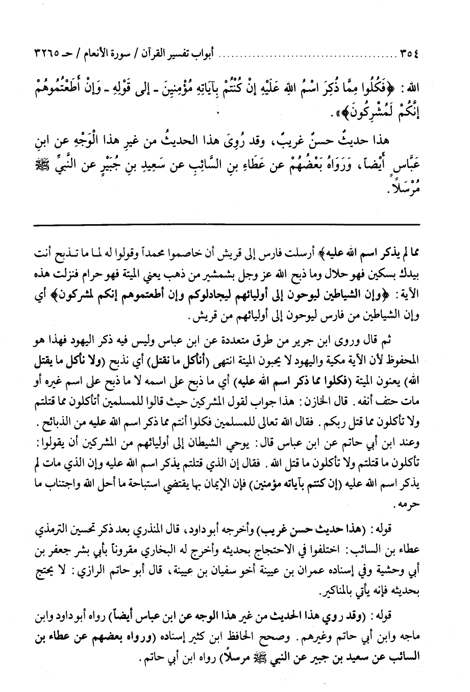 قَوْلُهُ (هَذَا حَدِيثٌ حَسَنٌ غَرِيبٌ) وَأَخْرَجَهُ أَبُو دَاوُدَ قَالَ الْمُنْذِرِيُّ بَعْدَ ذِكْرِ تَحْسِينِ التِّرْمِذِيِّ عَطَاءَ بْنَ السَّائِبِ اخْتَلَفُوا فِي الِاحْتِجَاجِ بِحَدِيثِهِ وَأَخْرَجَ لَهُ الْبُخَارِيُّ مَقْرُونًا بِأَبِي بِشْرٍ جَعْفَرِ بْنِ أَبِي وَحْشِيَّةَ وَفِي إِسْنَادِهِ عِمْرَانُ بْنُ عُيَيْنَةَ أَخُو سُفْيَانَ بْنِ عُيَيْنَةَ قَالَ أَبُو حَاتِمٍ الرَّازِيُّ لَا يُحْتَجُّ بِحَدِيثِهِ فَإِنَّهُ يَأْتِي بِالْمَنَاكِيرِ