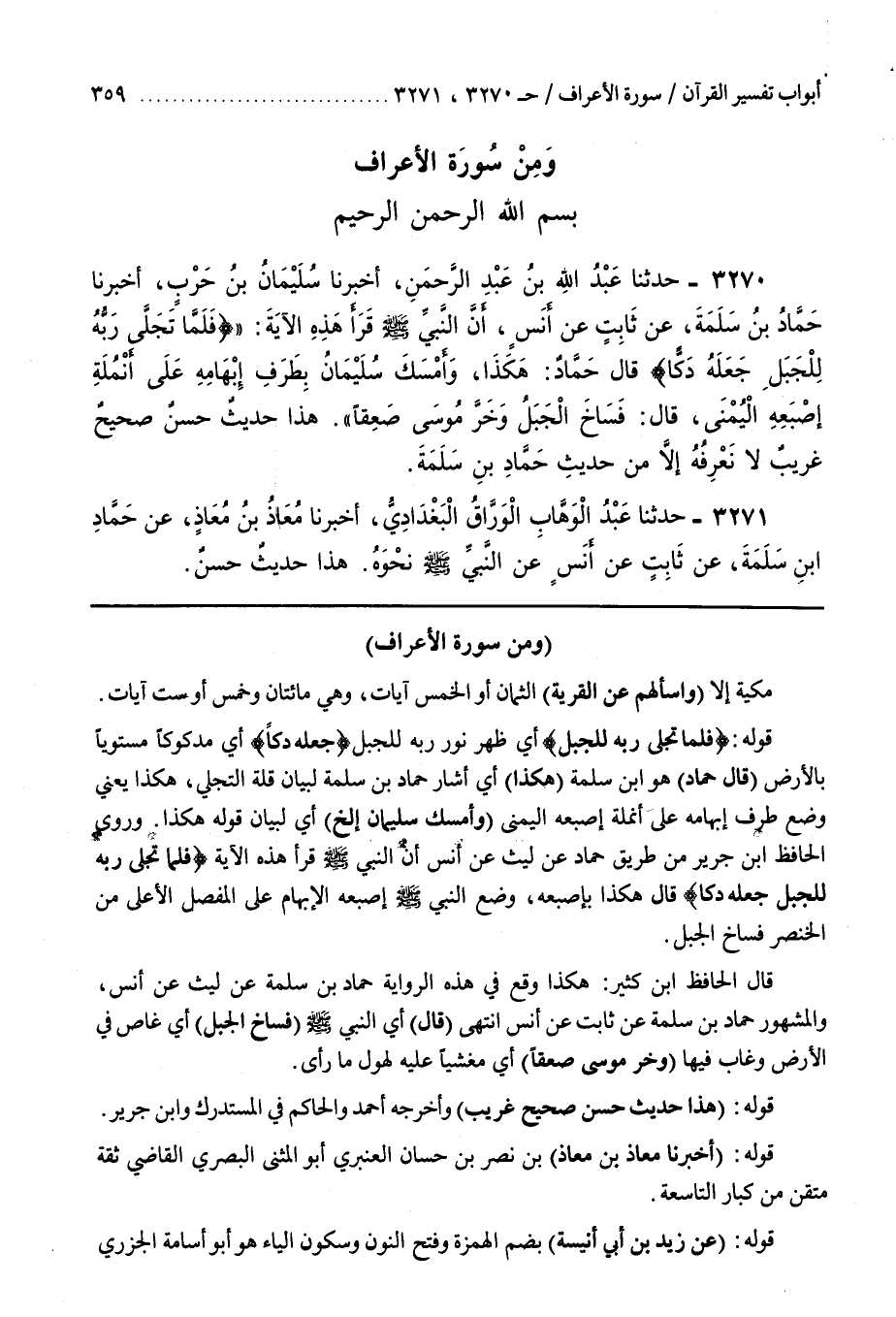 وَرَوَى الْحَافِظُ بن جَرِيرٍ مِنْ طَرِيقِ حَمَّادٍ عَنْ لَيْثٍ عَنْ أنس أن النبي قَرَأَ هَذِهِ الْآيَةَ (فَلَمَّا تَجَلَّى رَبُّهُ لِلْجَبَلِ جعله دكا) قال هكذا بإصبعه وضع النبي إِصْبَعَهُ الْإِبْهَامَ عَلَى الْمِفْصَلِ الْأَعْلَى مِنَ الْخِنْصَرِ فساخ الجبل